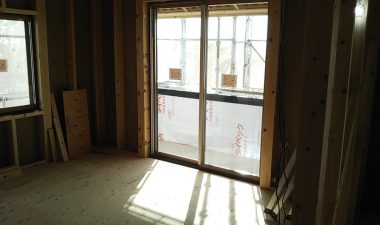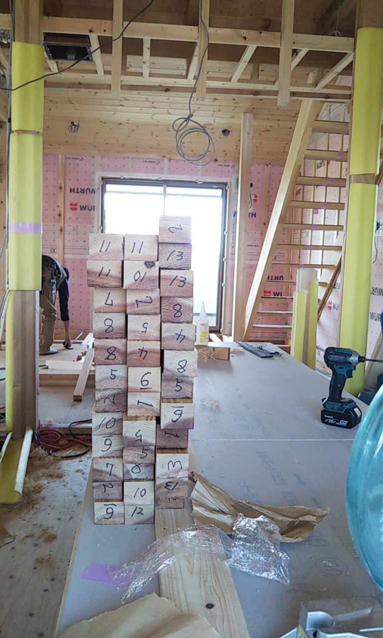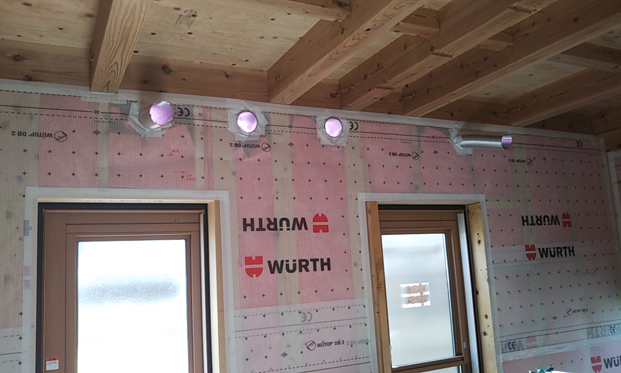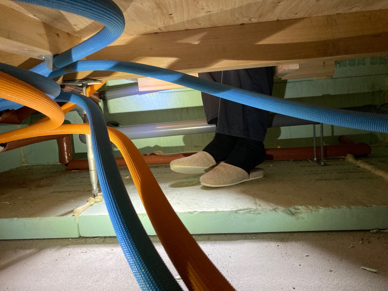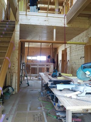 断熱気密工事はあらかた終わっており、できるだけ熱を逃がさない現場内となっていますが、電気業者さんに開けてもらった換気用のスリーブが空いているため、熱が少し逃げていきます。それでも現時点でストーブを焚けばそこまで凍えることなくお打合せができました。やはり断熱気密材の威力はこういう時にも効果を発揮します。