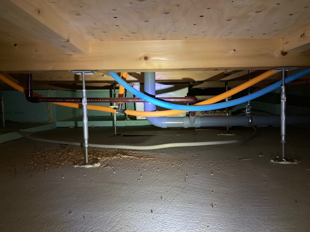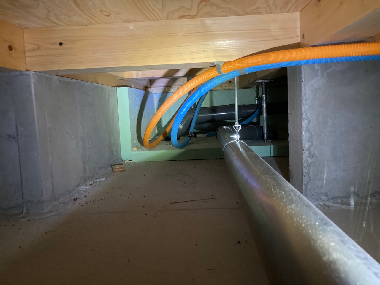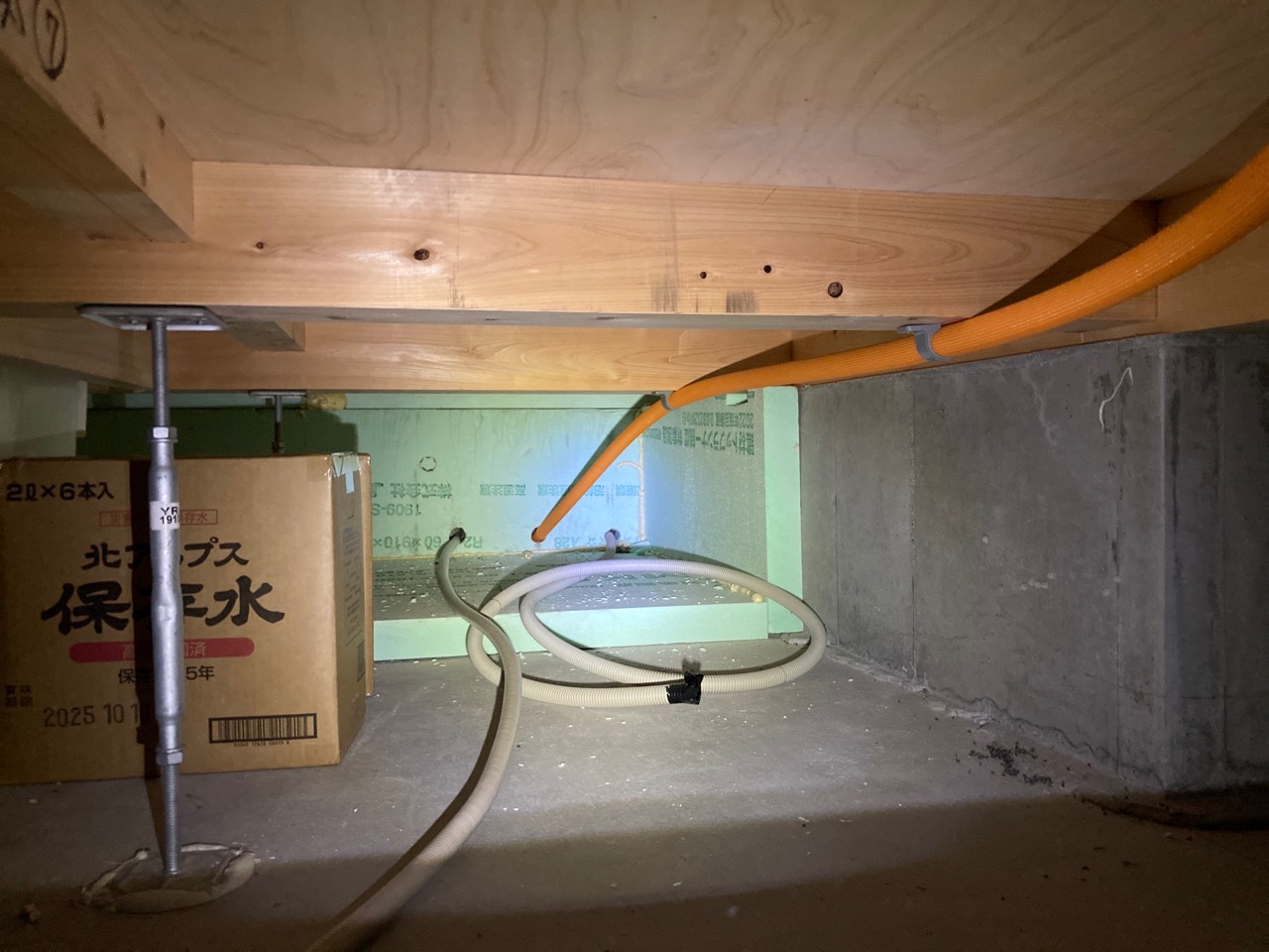 床下空間のチェック。給排水管に漏れが無いか、土台や大引、床組みに異常はないかを点検します。長期優良住宅ではこうやって床下に潜って点検を行う事ができるように基礎コンクリートの最低高さが規定されています。