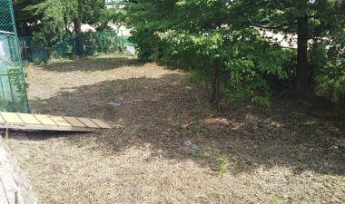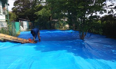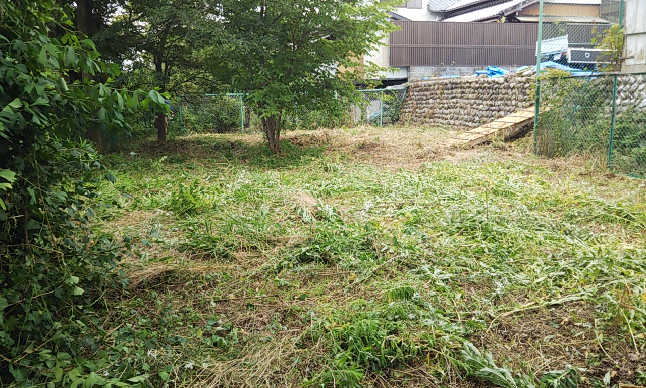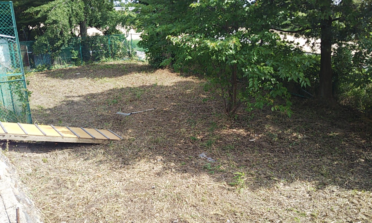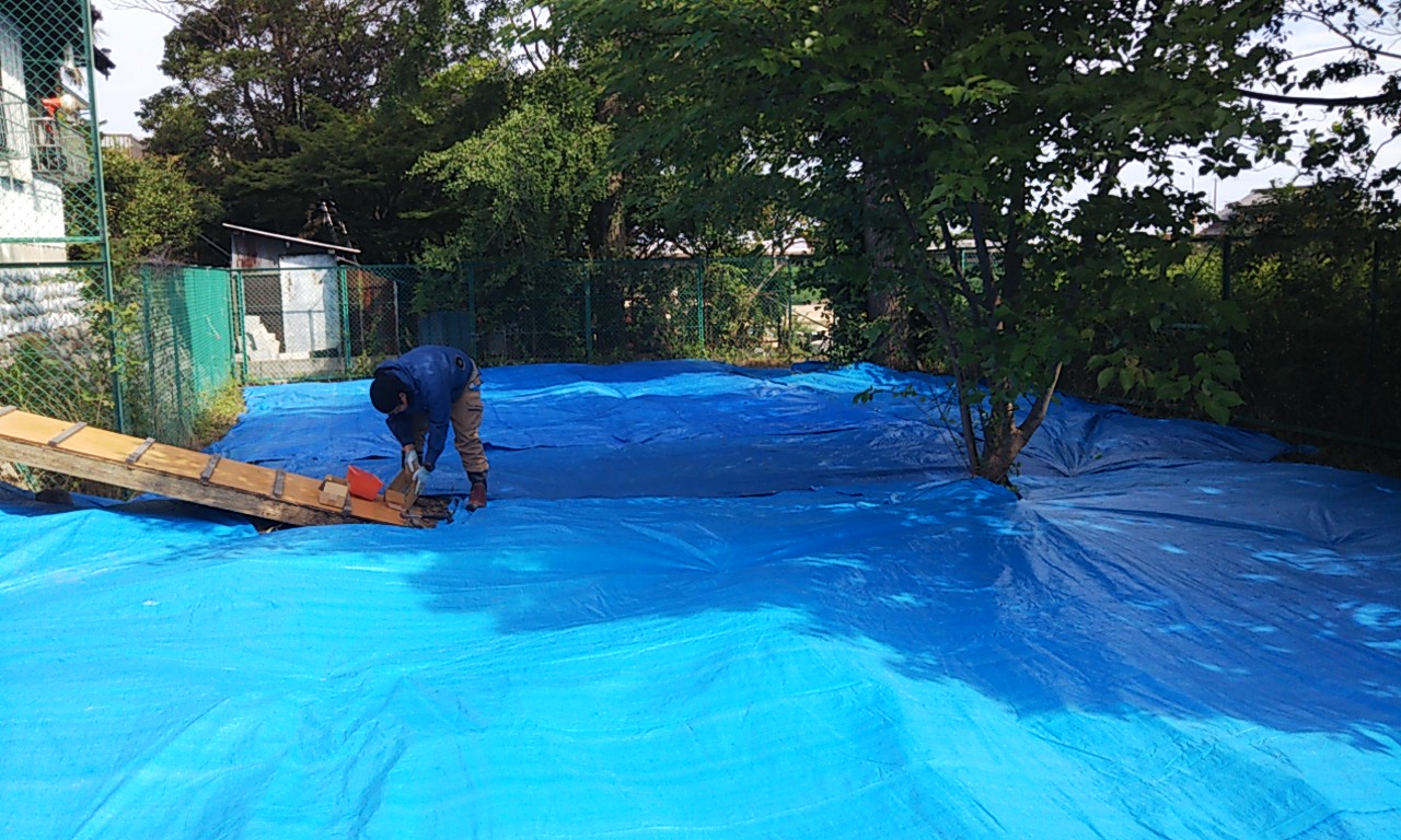 数時間の草と蚊との格闘の末、綺麗に刈り取りました。工事までに再び草が育たないようにブルーシート養生を施します。