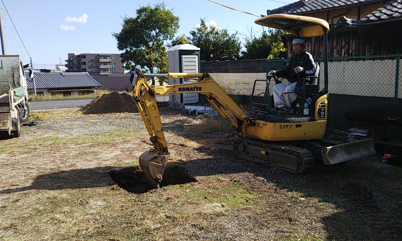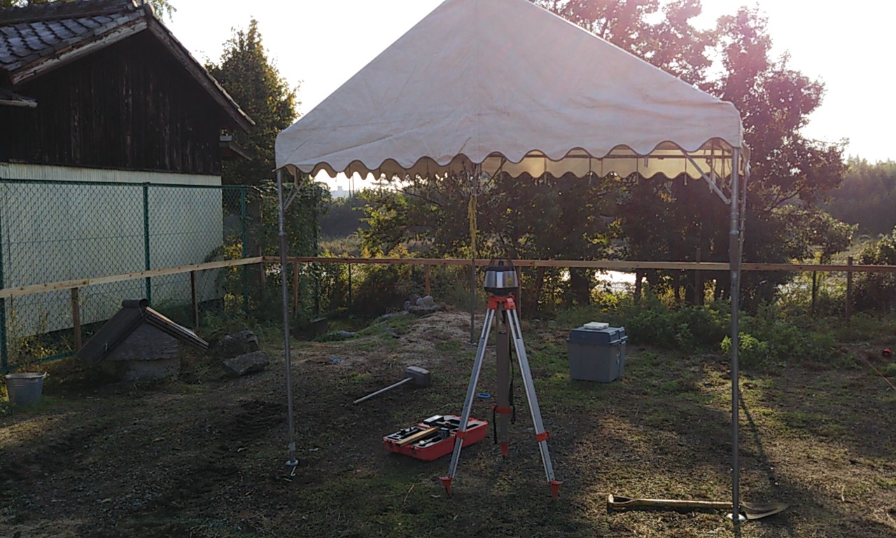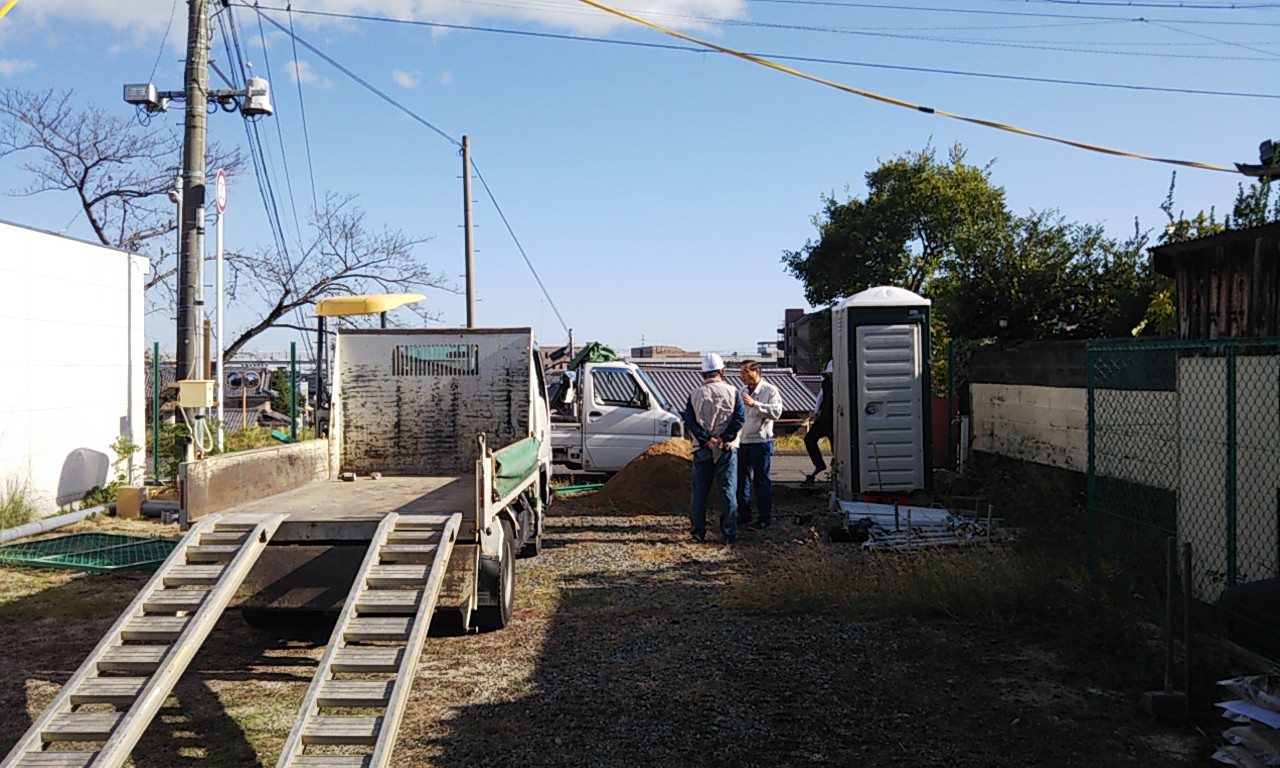 仮設トイレ、仮設電源なども据えられ、いよいよ工事開始の様相を呈してきました。まずは地鎮祭の準備です。今回はN様のお知り合いのお寺で行う事になりました。宗派によるためか、少し変わった方法で、まずは敷地中央に1m立方の穴を掘ってほしいとの事。鎮物などをすべて埋設するそうです。