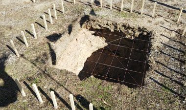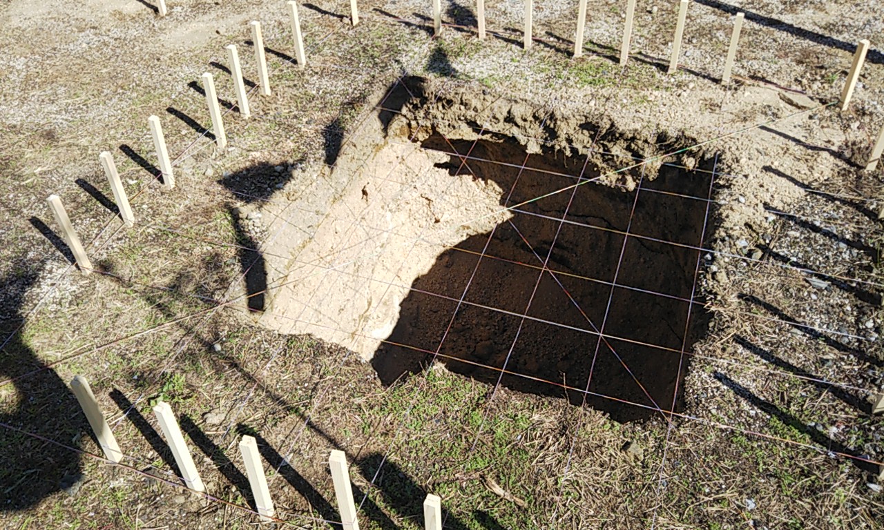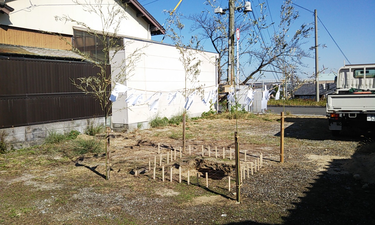 掘削と準備から1週間経ち、地鎮祭当日を迎えました。四方の木杭に幣を挟み、ますます陰陽道の様相を呈してきた現場の状況です。