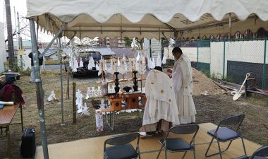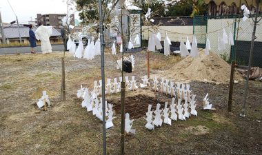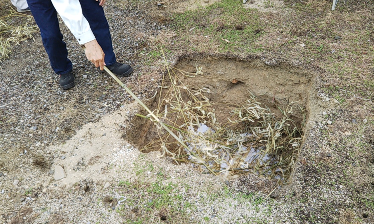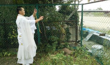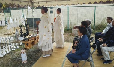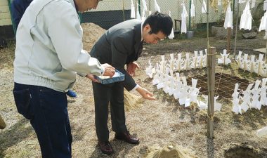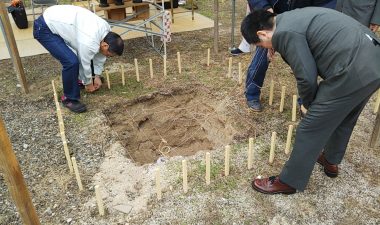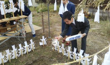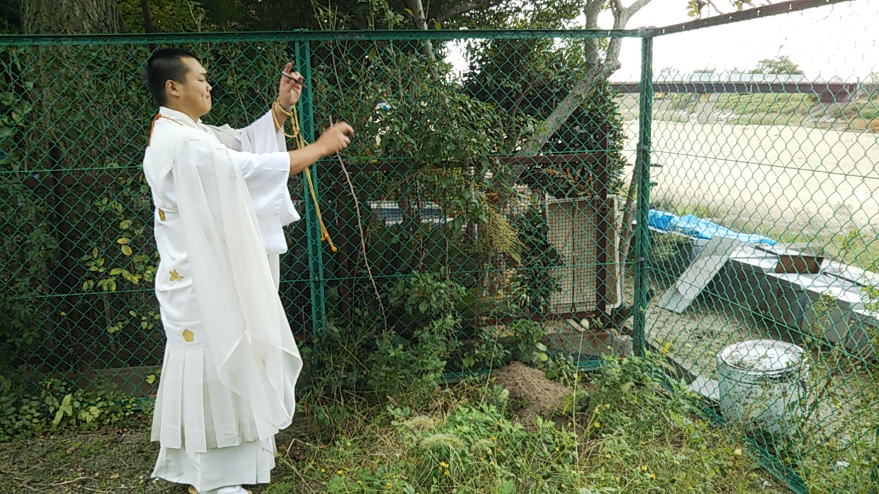 式典の最後にはお供え物、塩、米、酒など、使用した幣、木杭などをすべて掘削した穴の中に安置していきます。神式でいうところの鎮物にあたる事になる物です。