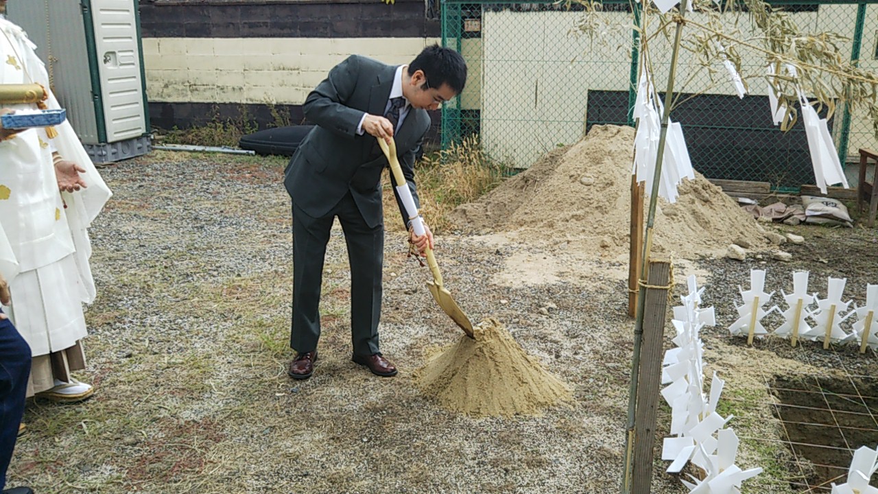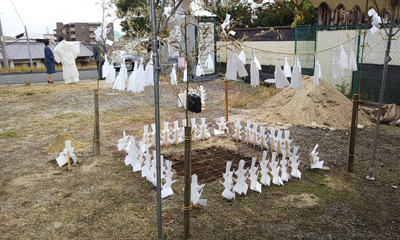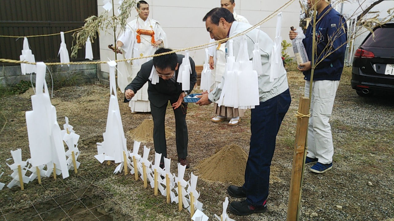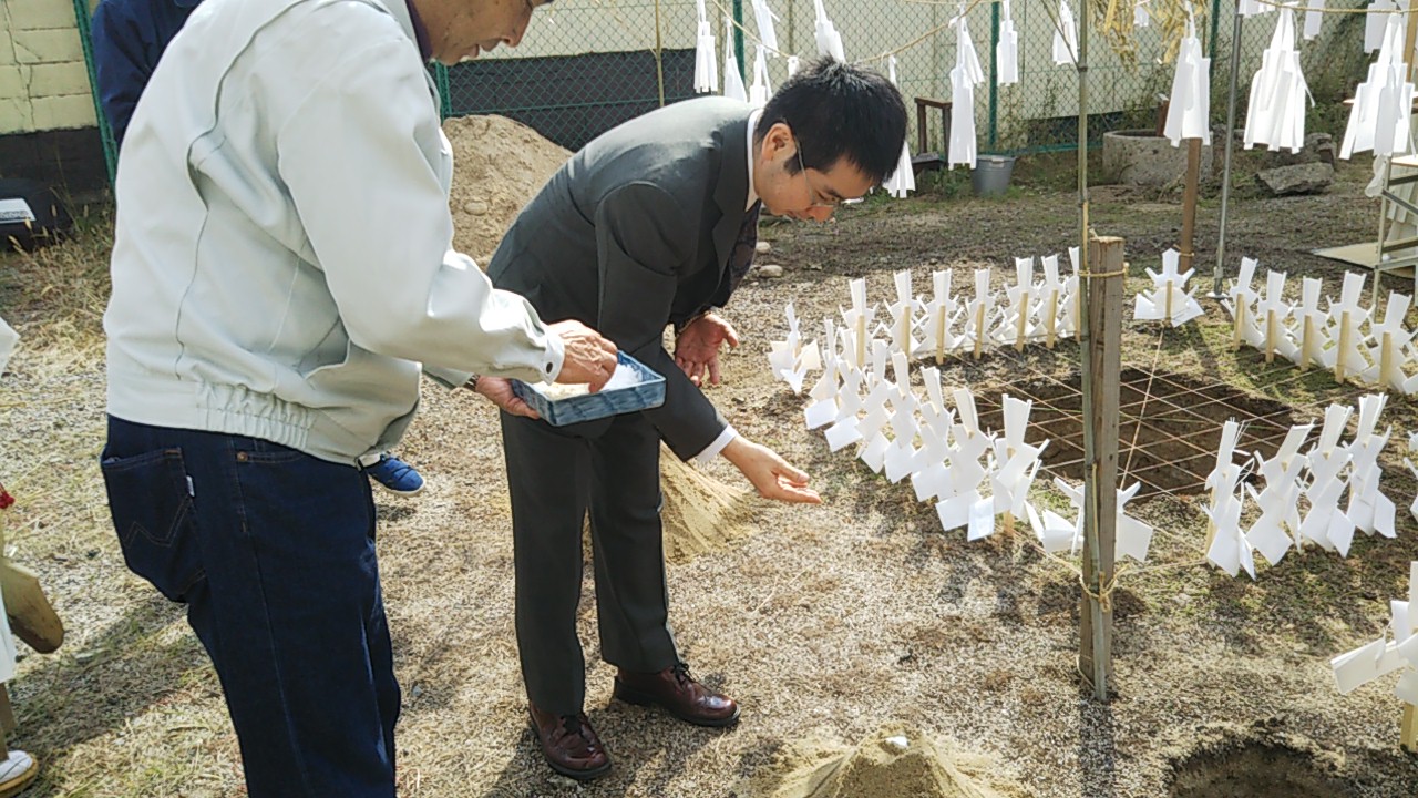 全ての物を鎮め終え、無事に地鎮祭が終了しました。祭事を行ってもらいました僧侶の方に聞くと、分かっている限りではこの式典のやり方というのが一番古来から伝わる方法だとか。本日は貴重なものを見せてもらいました。