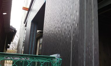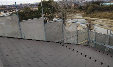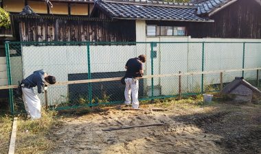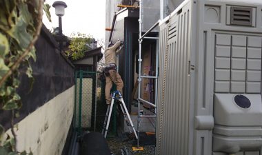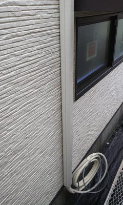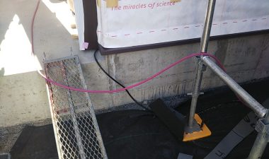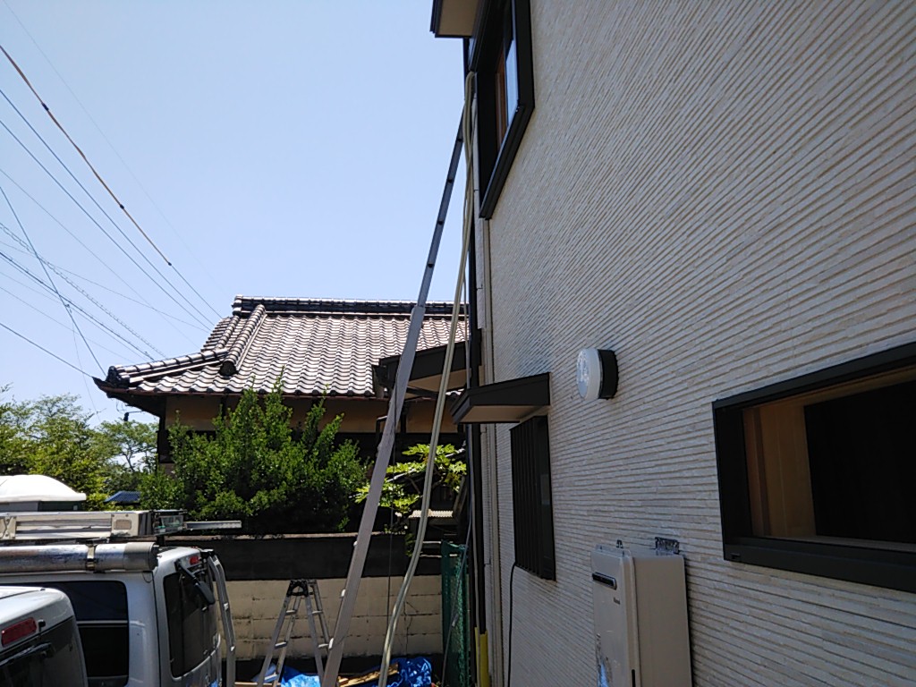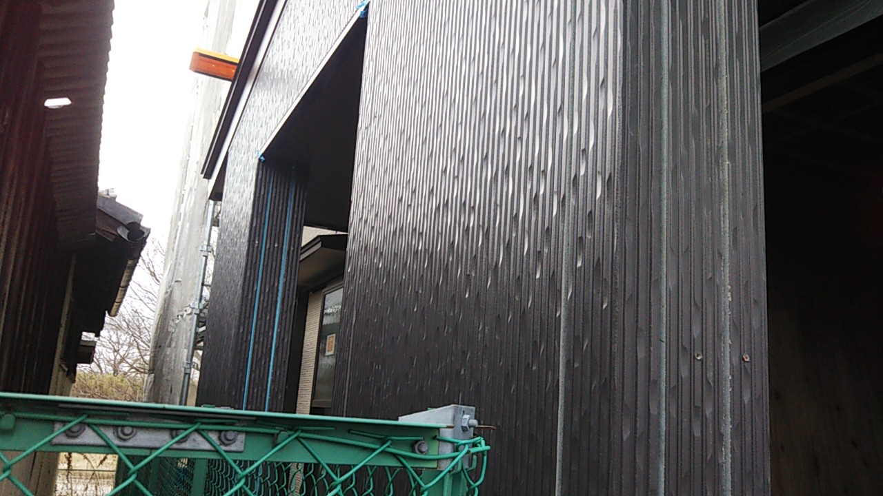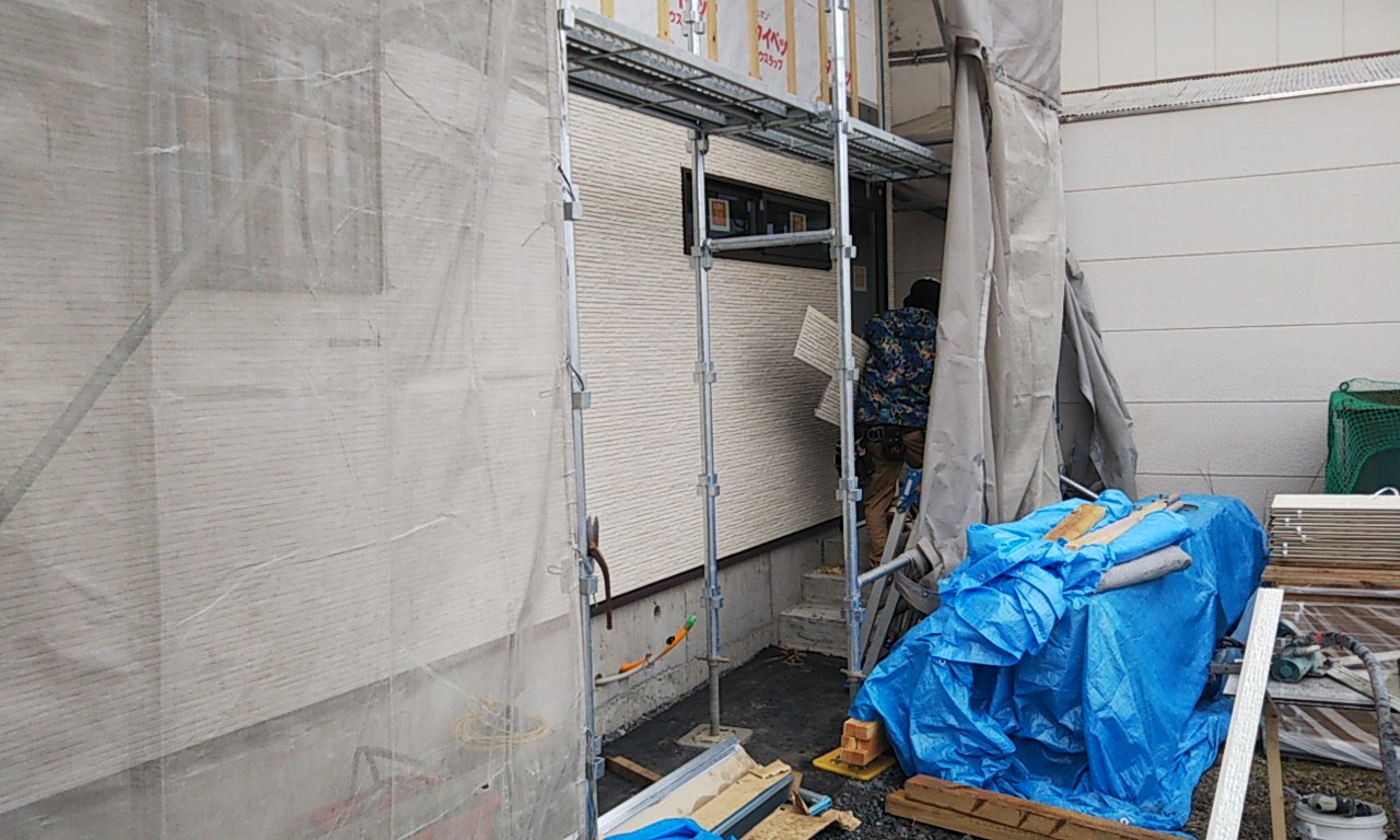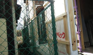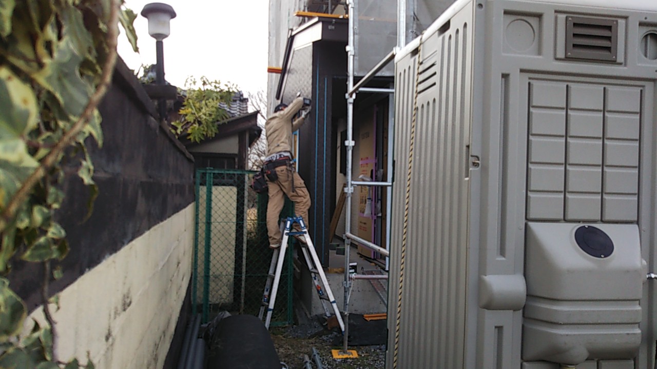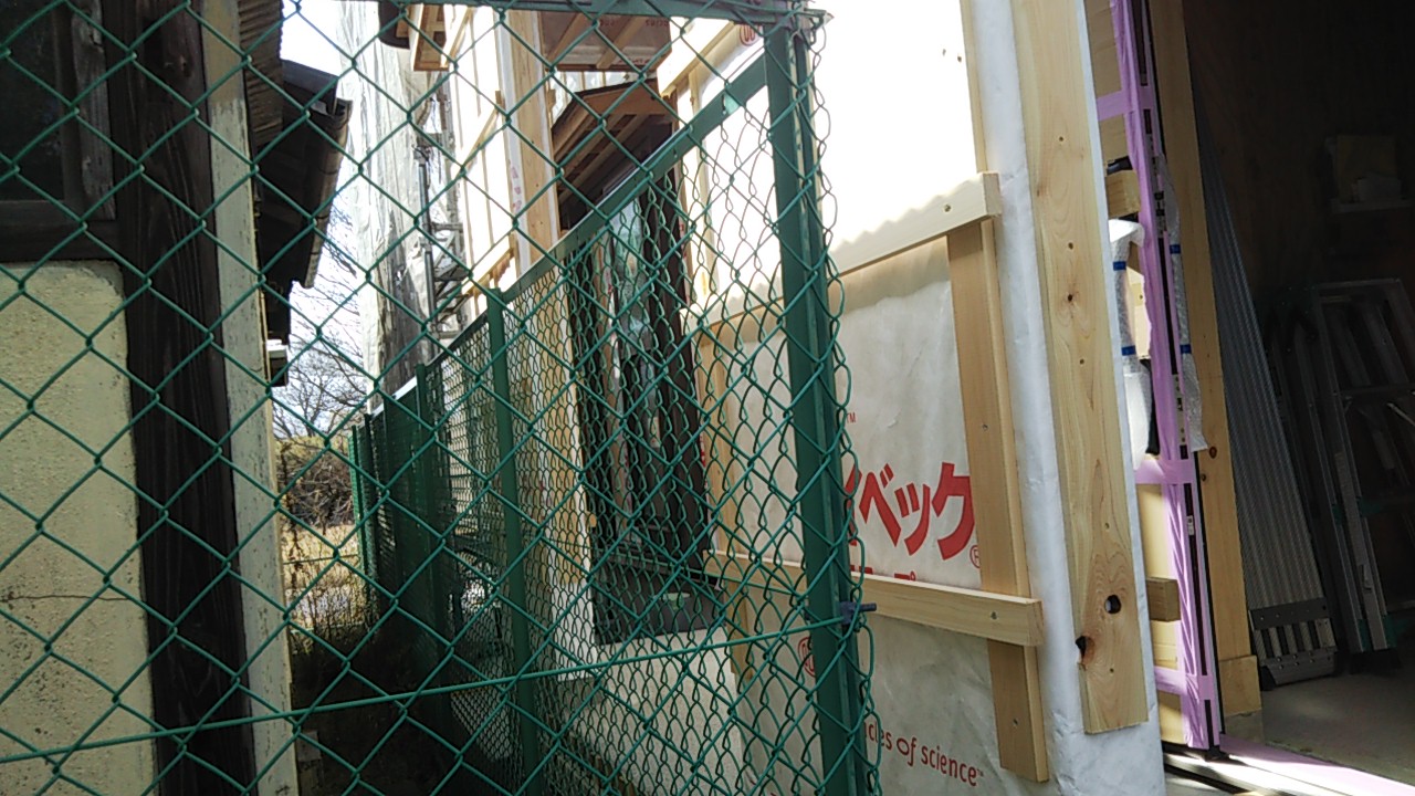 既設のフェンスぎりぎりに迫る下地。とっても作業しづらそうです。が、筆者が昔携わっていた京都市の現場では極端に言えば握り拳大の寸法すらない部分の外壁も施工していました。まだまだこれは狭いうちには入りません。