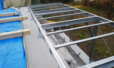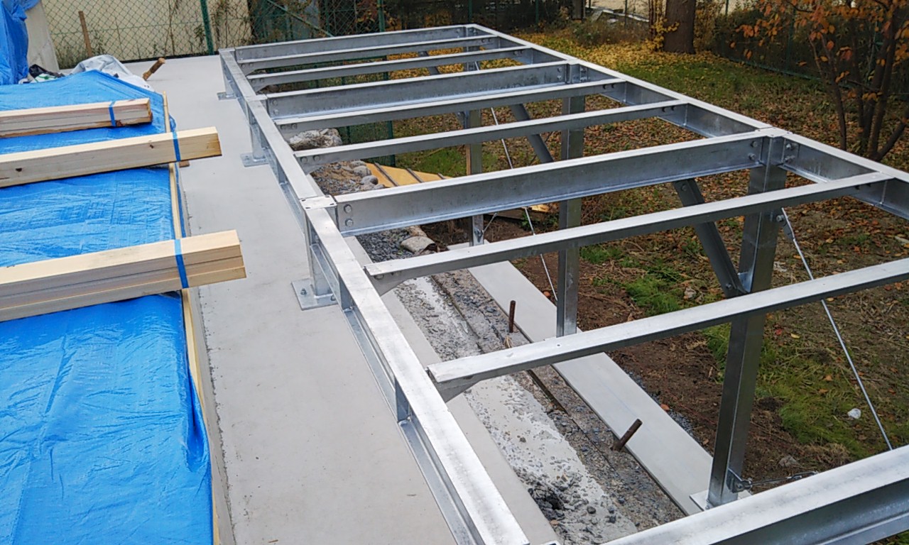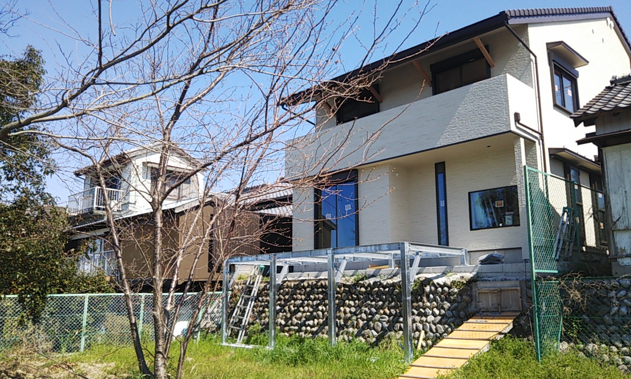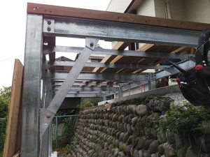 リビングより外部の河川に面する部分に大きなデッキを作成したいため、高低差がある部分には鉄骨で脚を組みました。京都鴨川沿いの納涼川床を思い出させます。