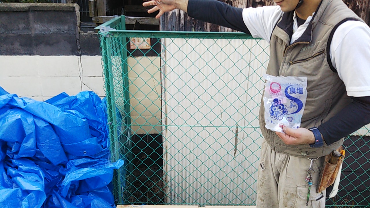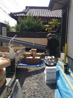 現場まで到着し、いざ搬入!と意気込みはするものの、駐車場に面しては大きな開口部は無く、小窓から1束ずつ搬入するしかないという状況。小窓を傷つけないようにも細心の注意を払う必要があり、余分な体力を使います。