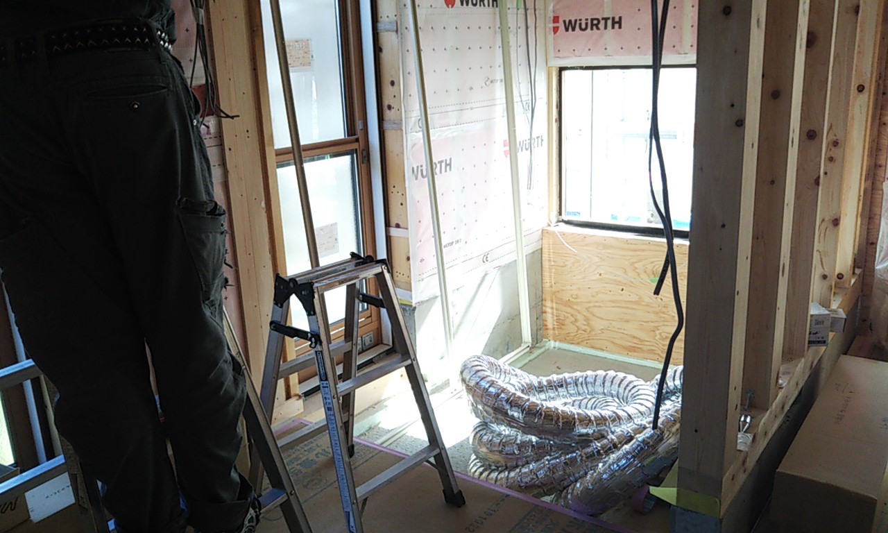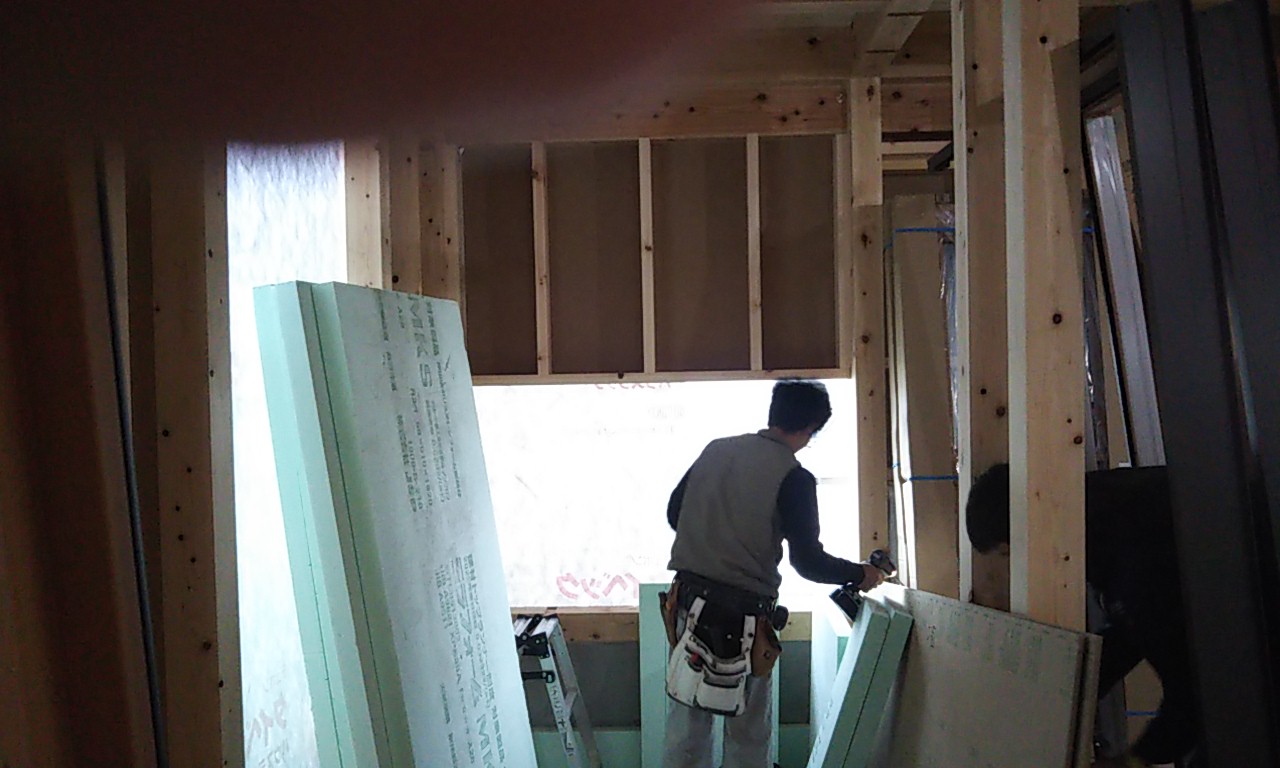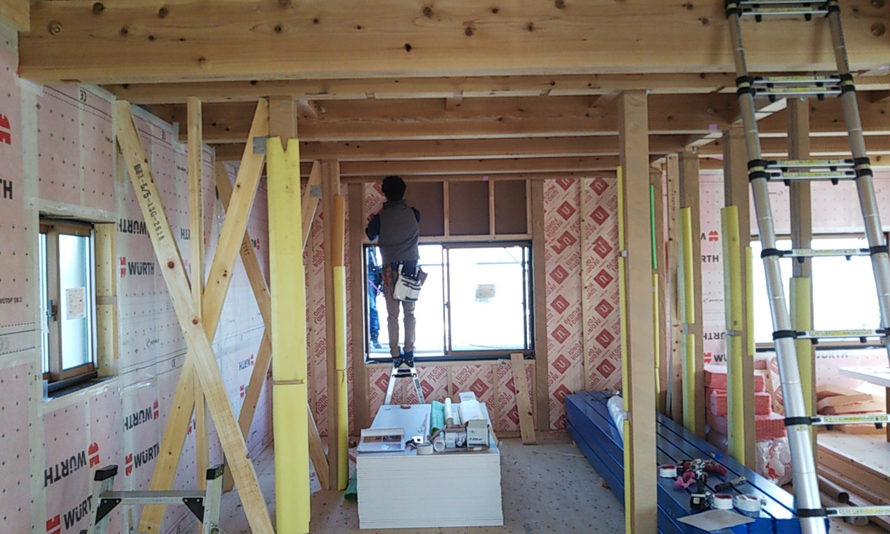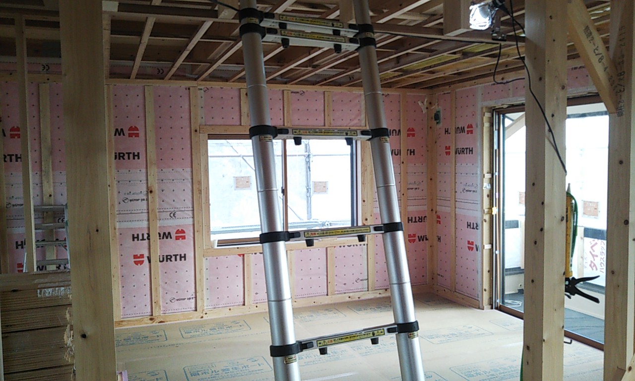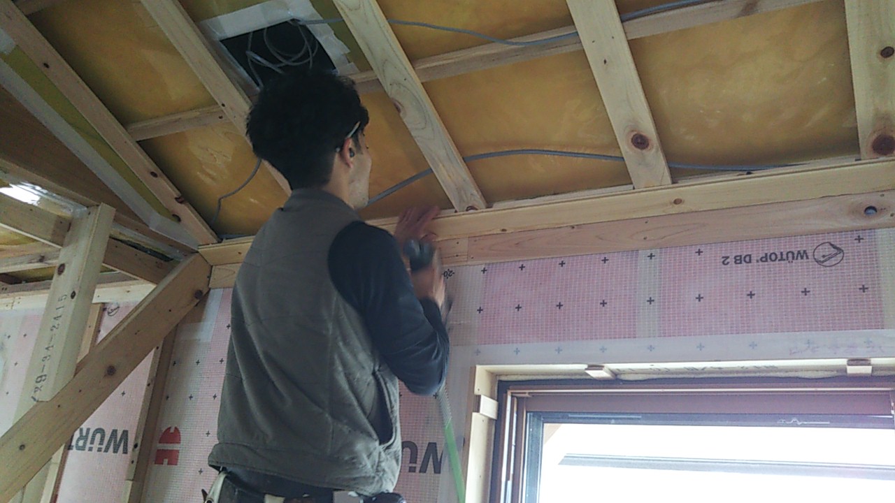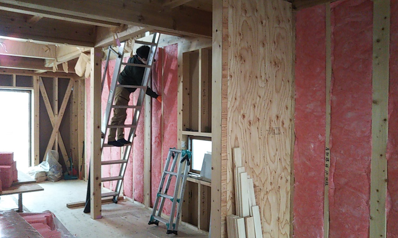 断熱気密工事がほぼ完了してきました。ここへきてこの暖冬でも寒い日が多くなってきましたが、今日のように晴天ならば窓から陽射しが入り、室温が上昇しても断熱材によって熱を逃がすことなく非常に暖かい環境で作業ができます。