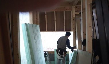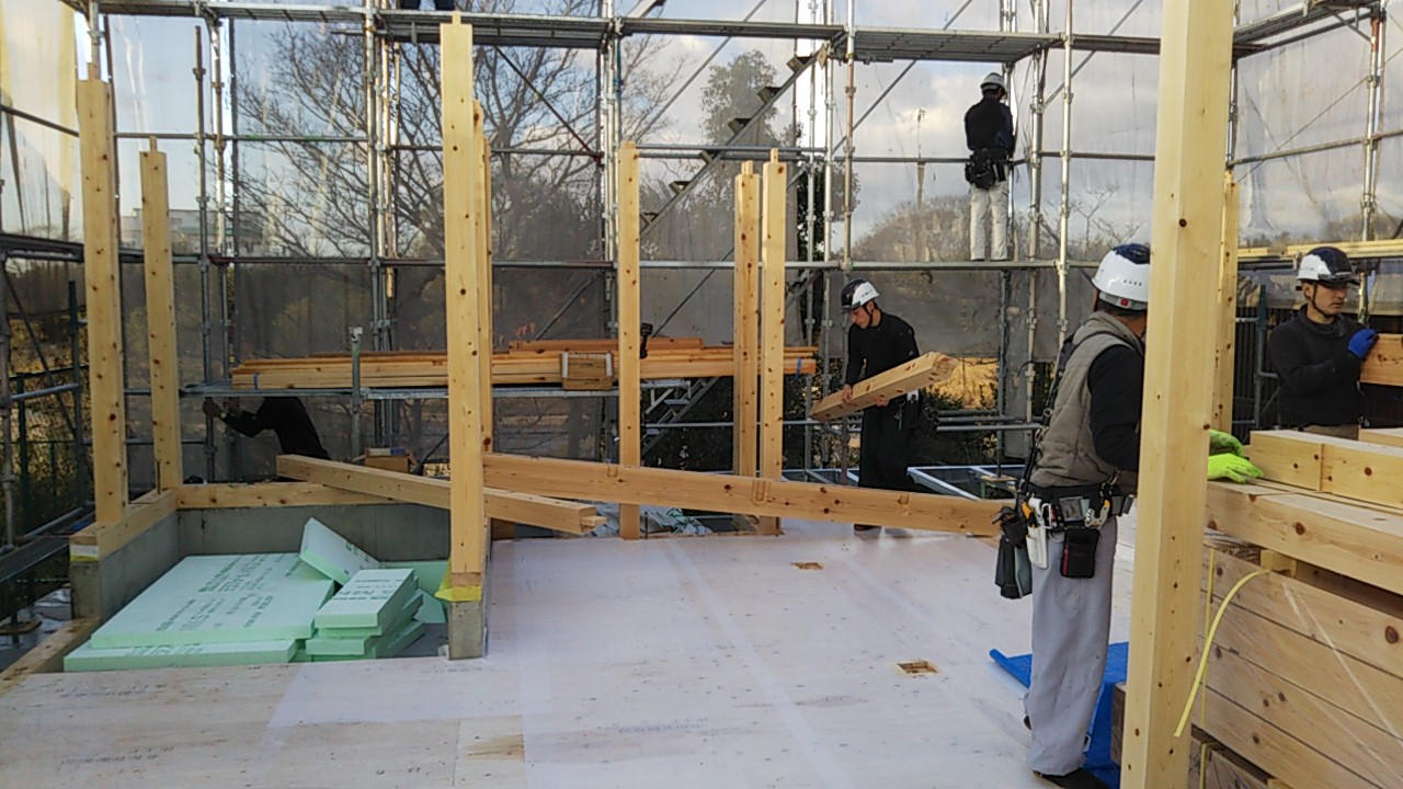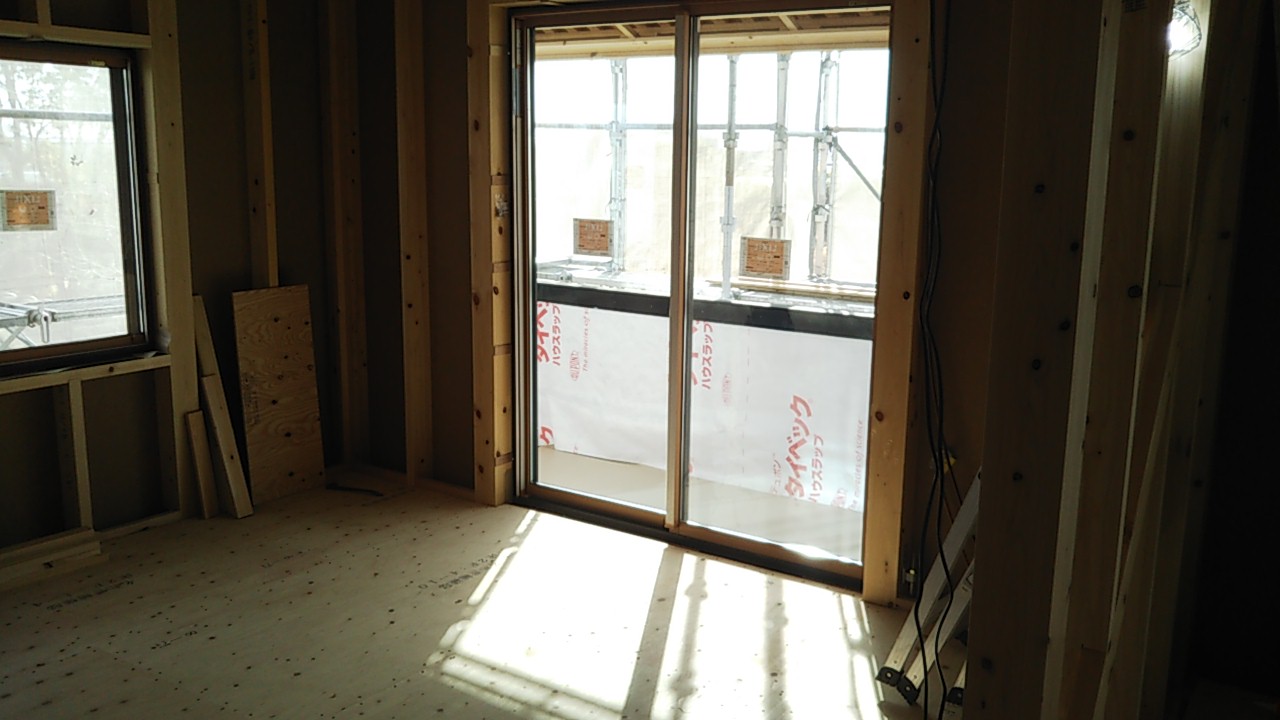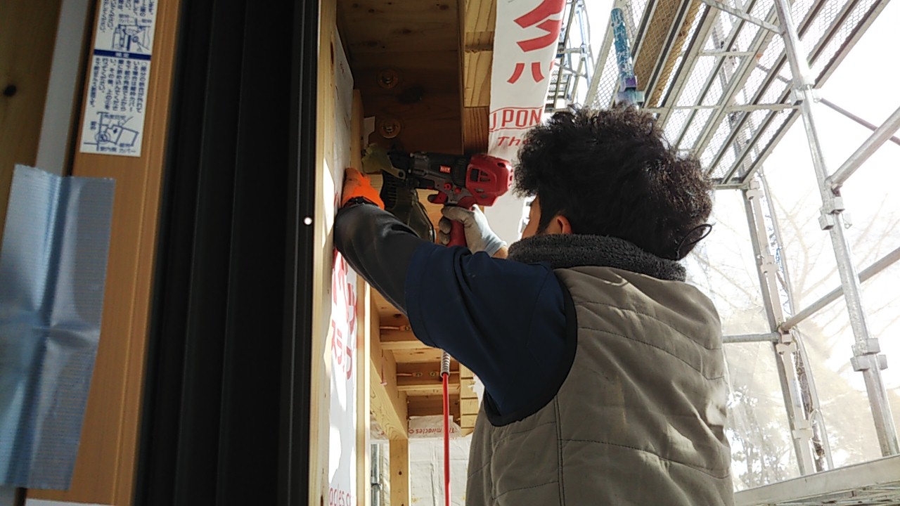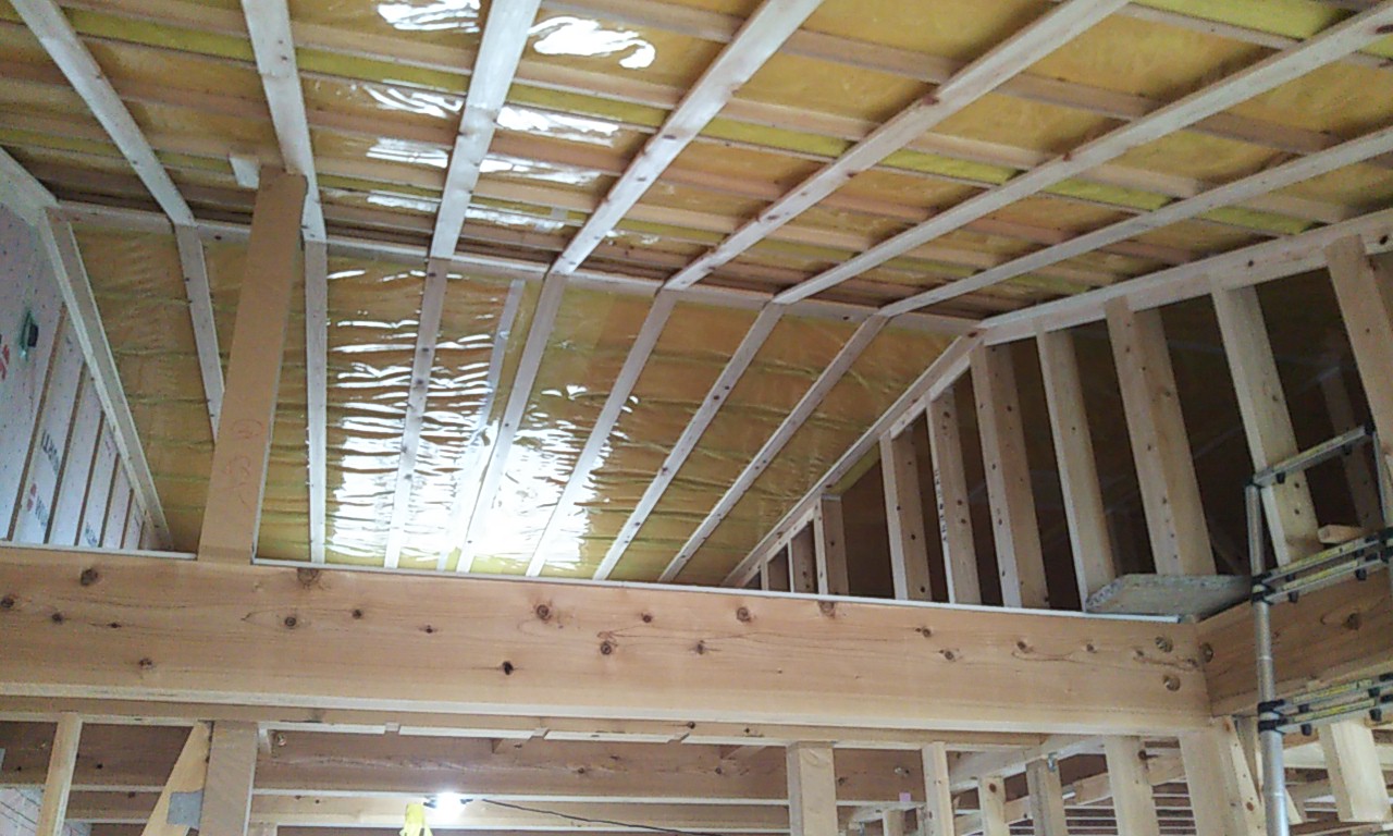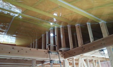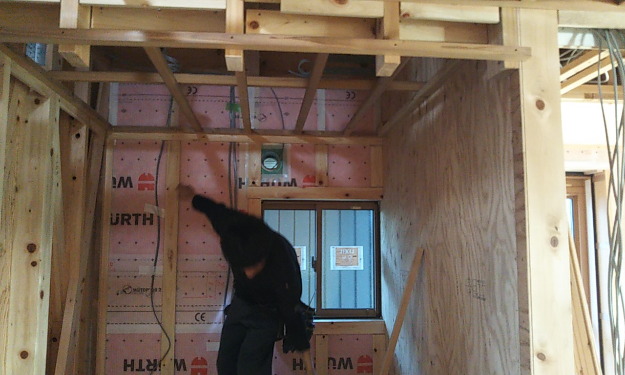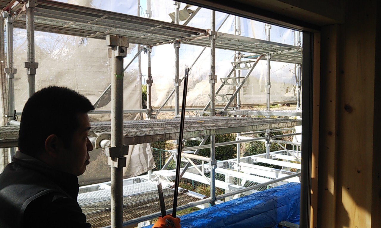 断熱気密工事がほぼ完了してきました。ここへきてこの暖冬でも寒い日が多くなってきましたが、今日のように晴天ならば窓から陽射しが入り、室温が上昇しても断熱材によって熱を逃がすことなく非常に暖かい環境で作業ができます。