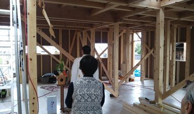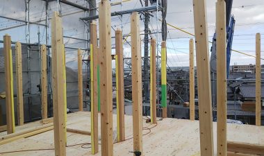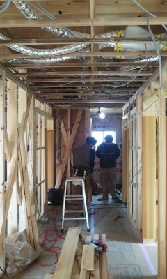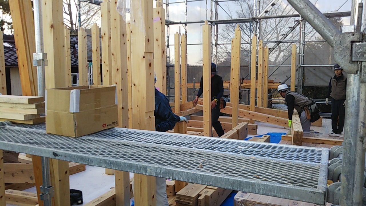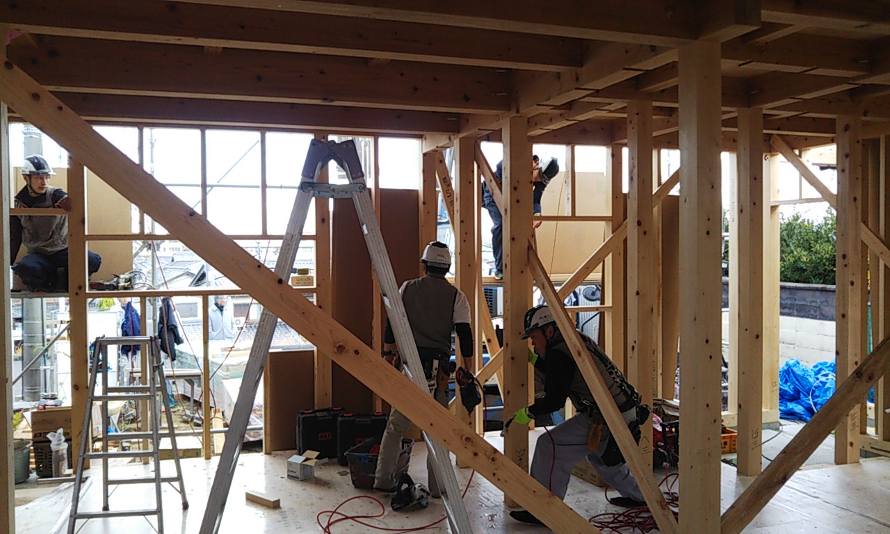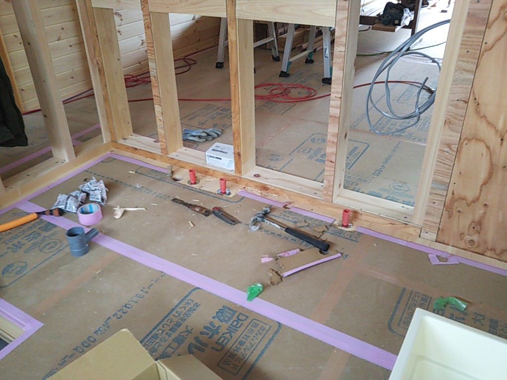 本日は大工さんの他に左官、水道、電気の各業者さんが入り乱れて現場はてんやわんやの状態です。
