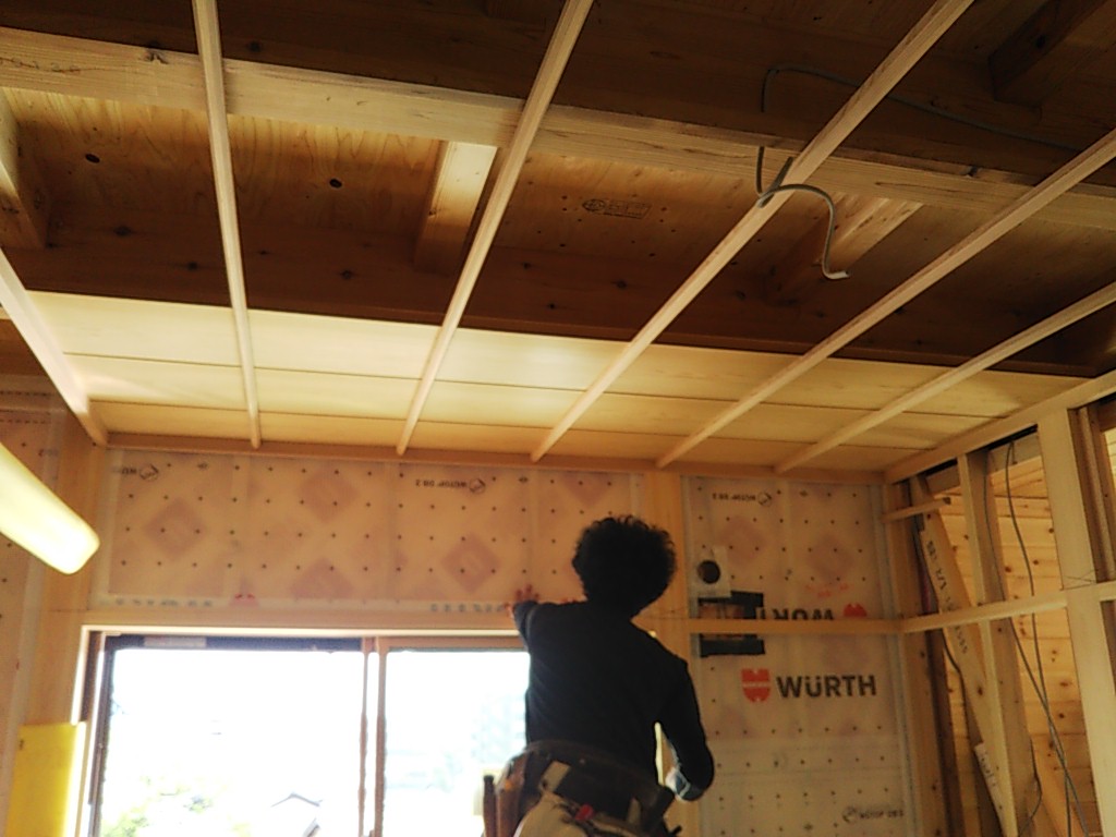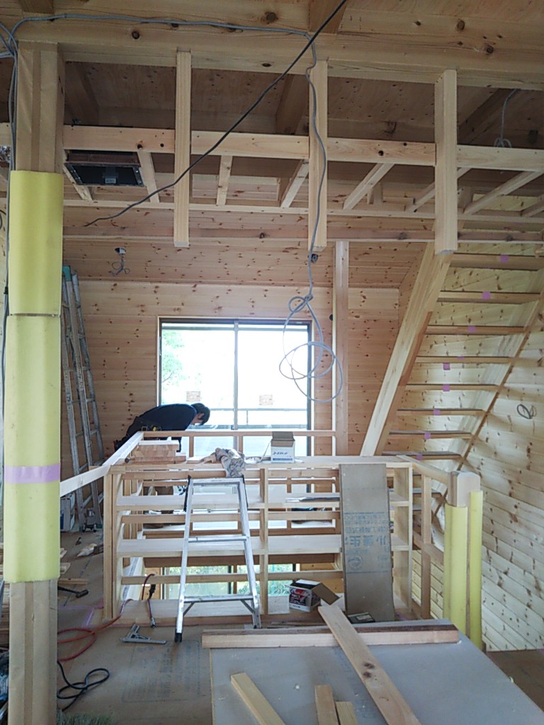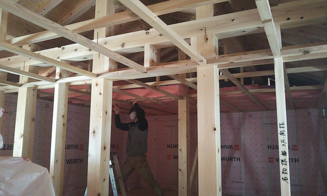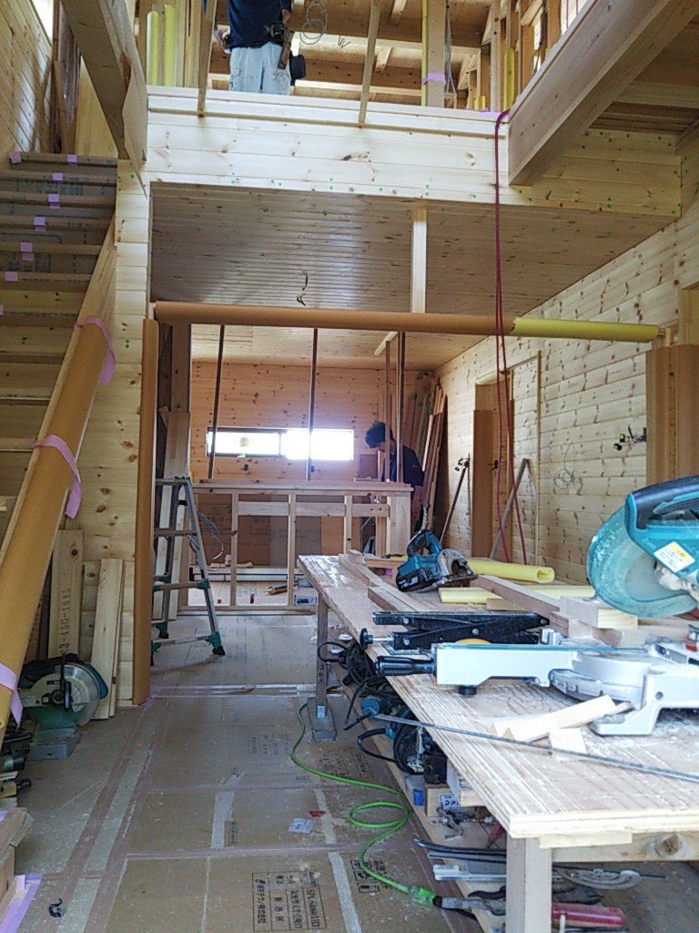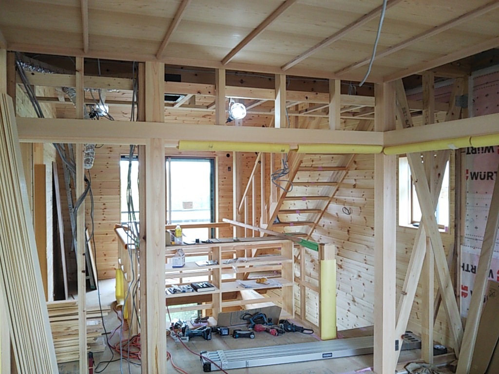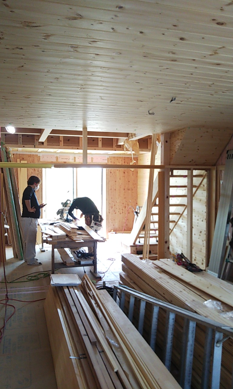 内部は大工さんによる壁下地、天井下地がほぼ完了。明日から工場へ加工に行くそうです。