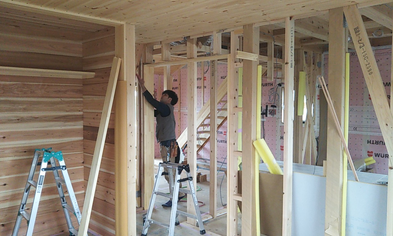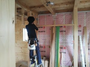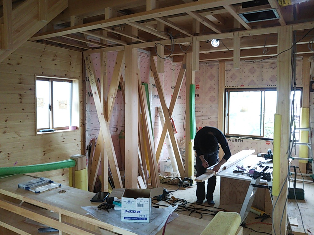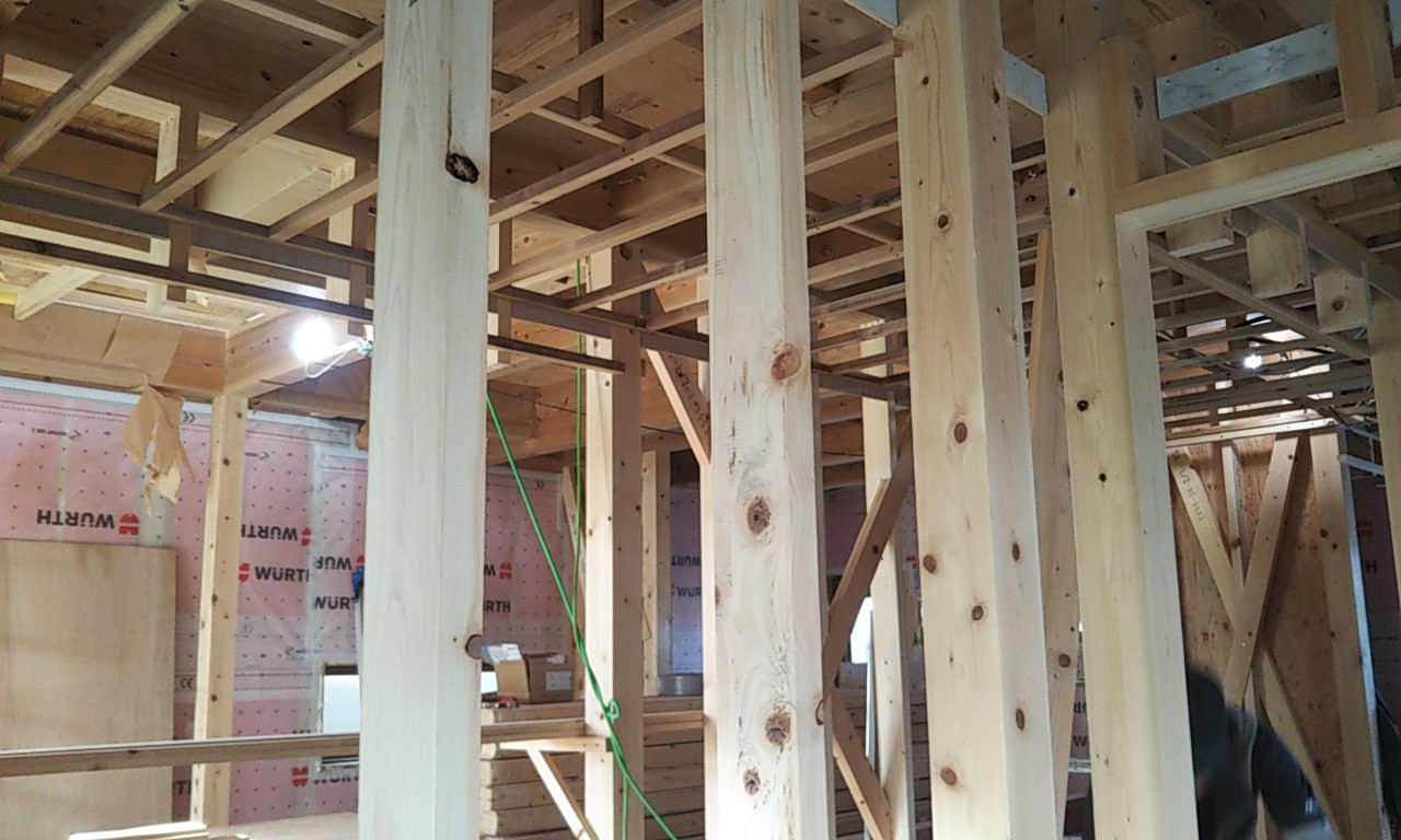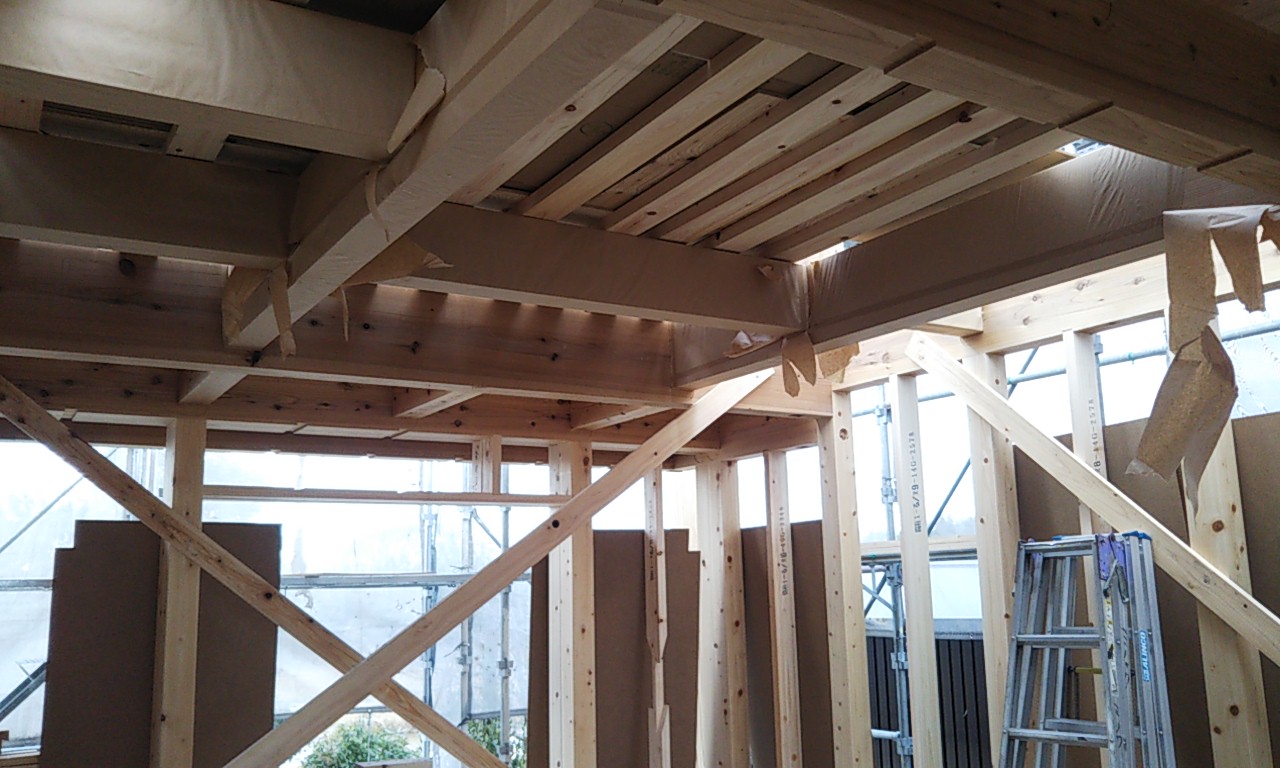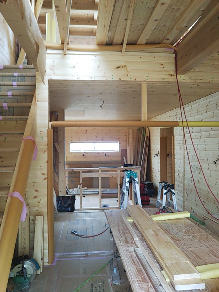 内部は大工さんによる壁下地、天井下地がほぼ完了。明日から工場へ加工に行くそうです。
