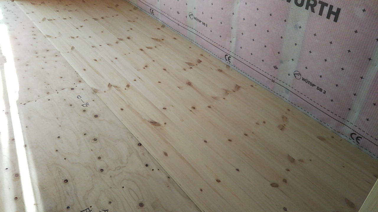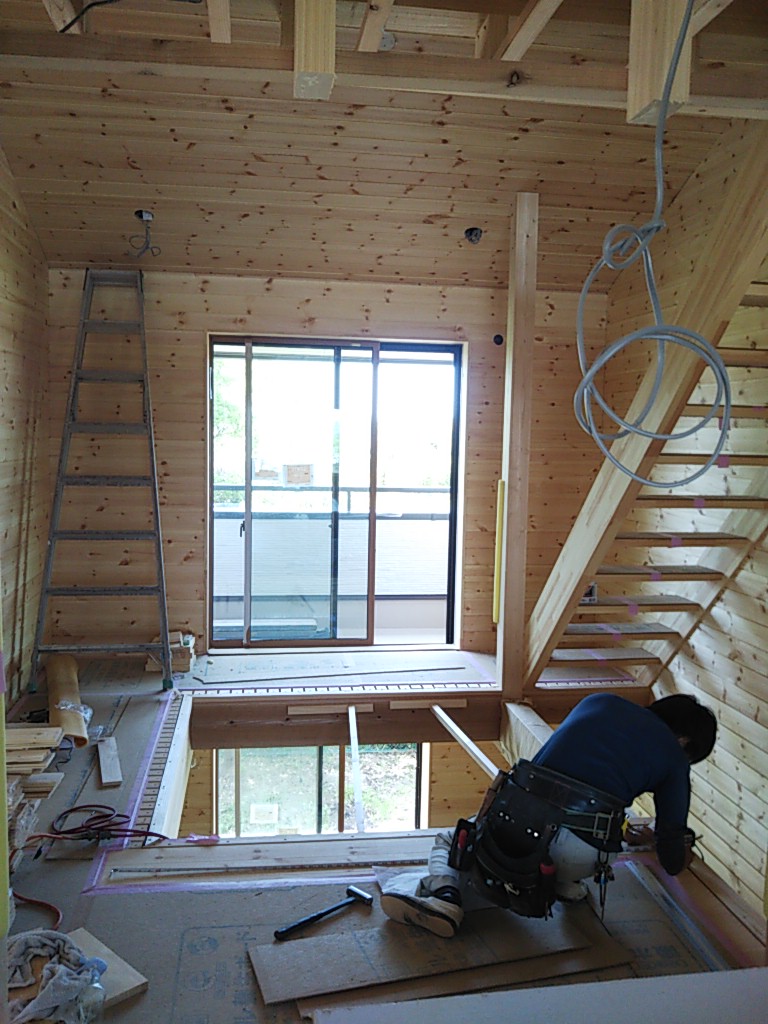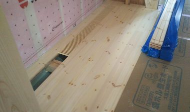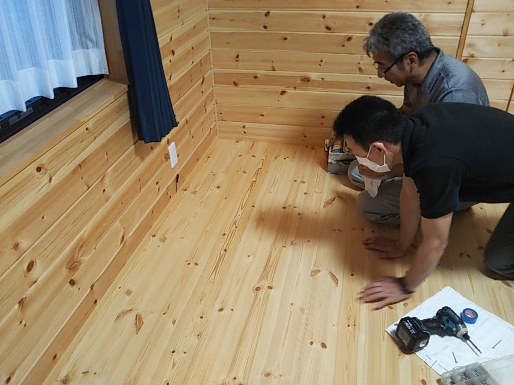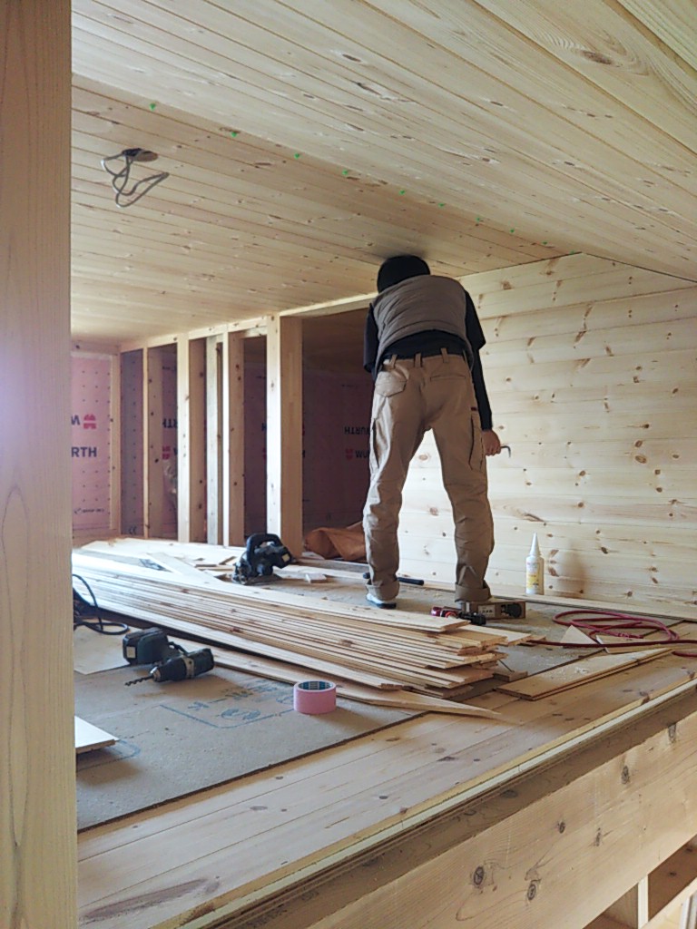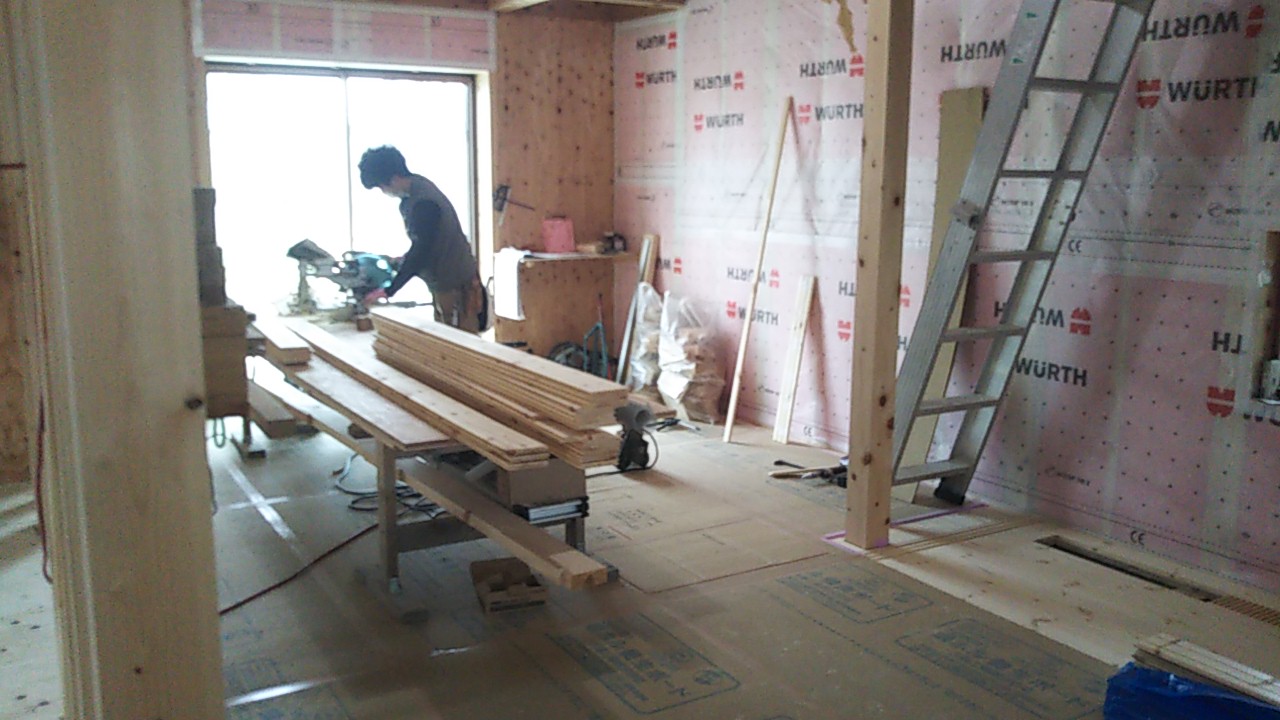 フローリング張工事が開始されました。今回はパインの床材を使用します。下地の構造用合板と色目や節が似ているのでどのあたりまで張っているのか分かりづらいですかね。
