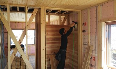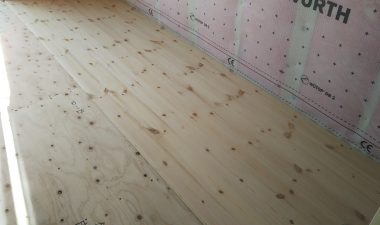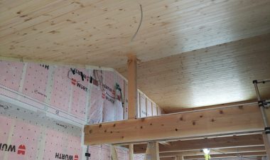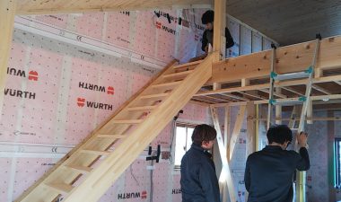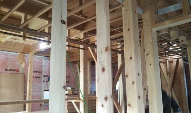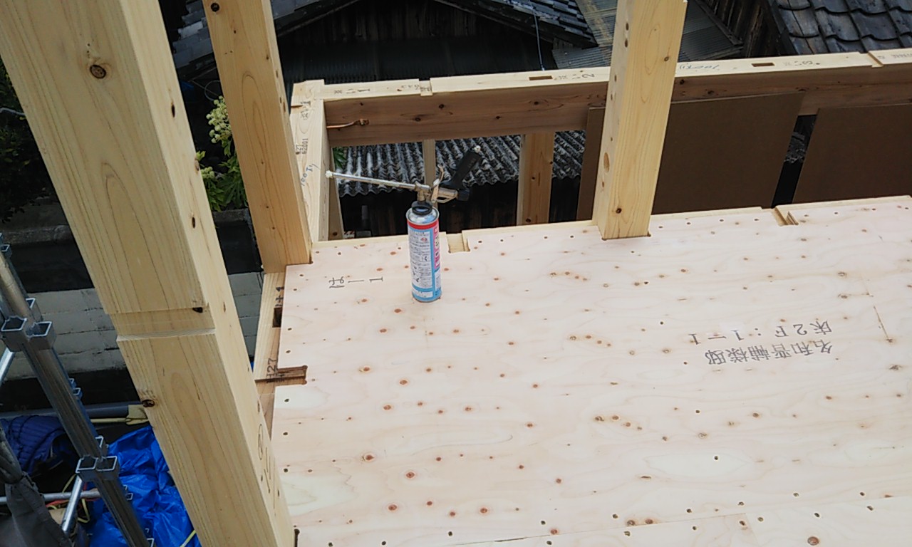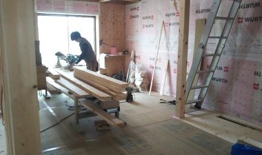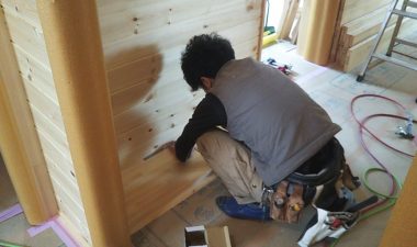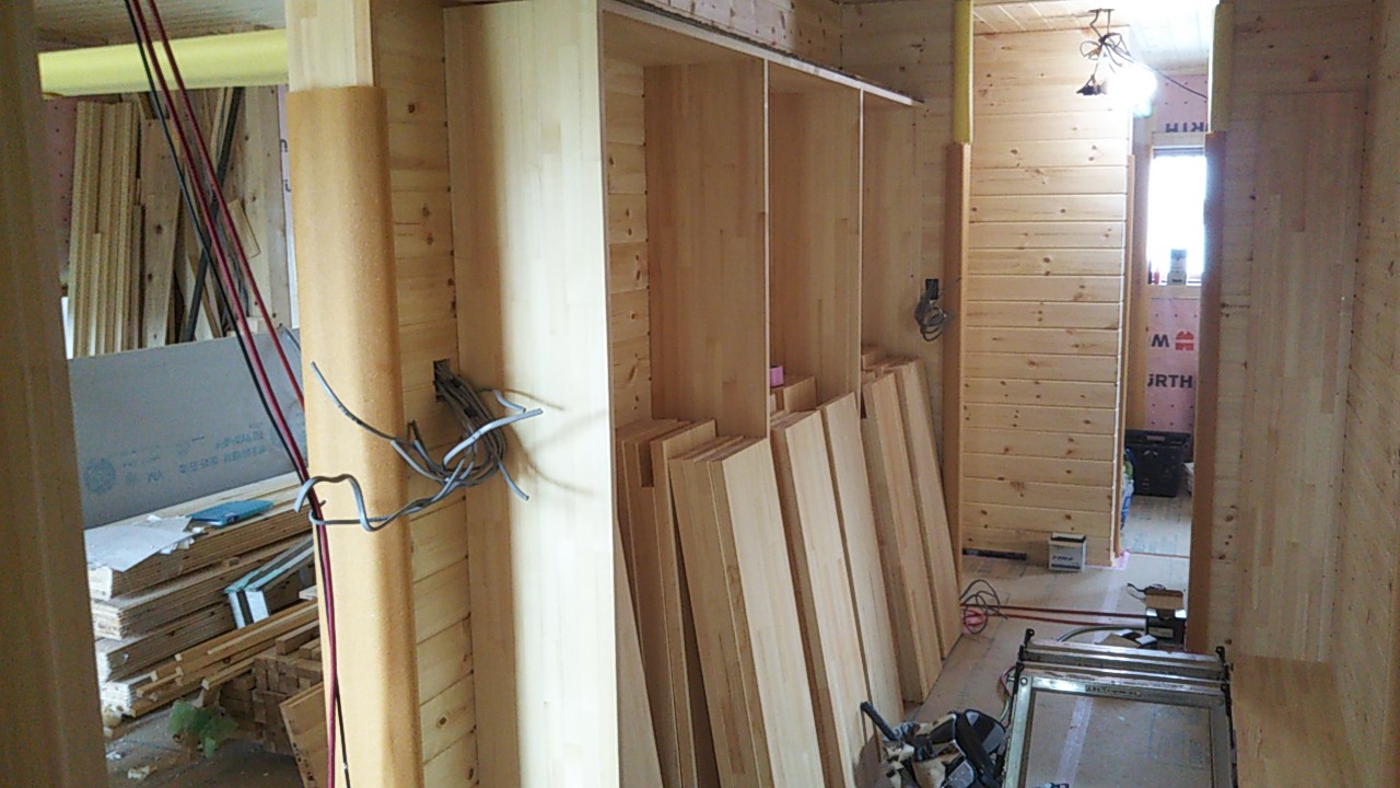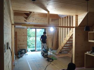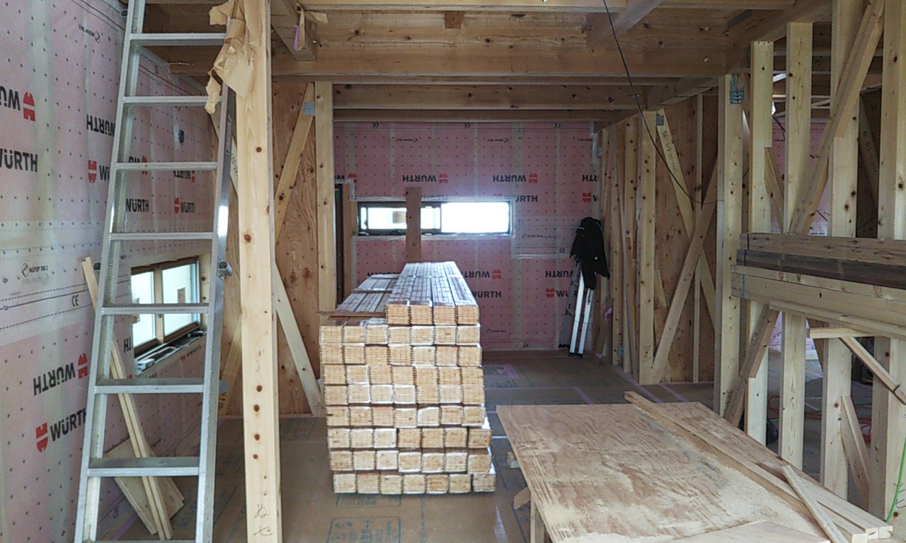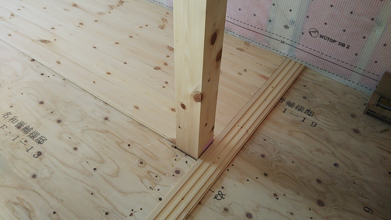 フローリング張工事が開始されました。今回はパインの床材を使用します。下地の構造用合板と色目や節が似ているのでどのあたりまで張っているのか分かりづらいですかね。