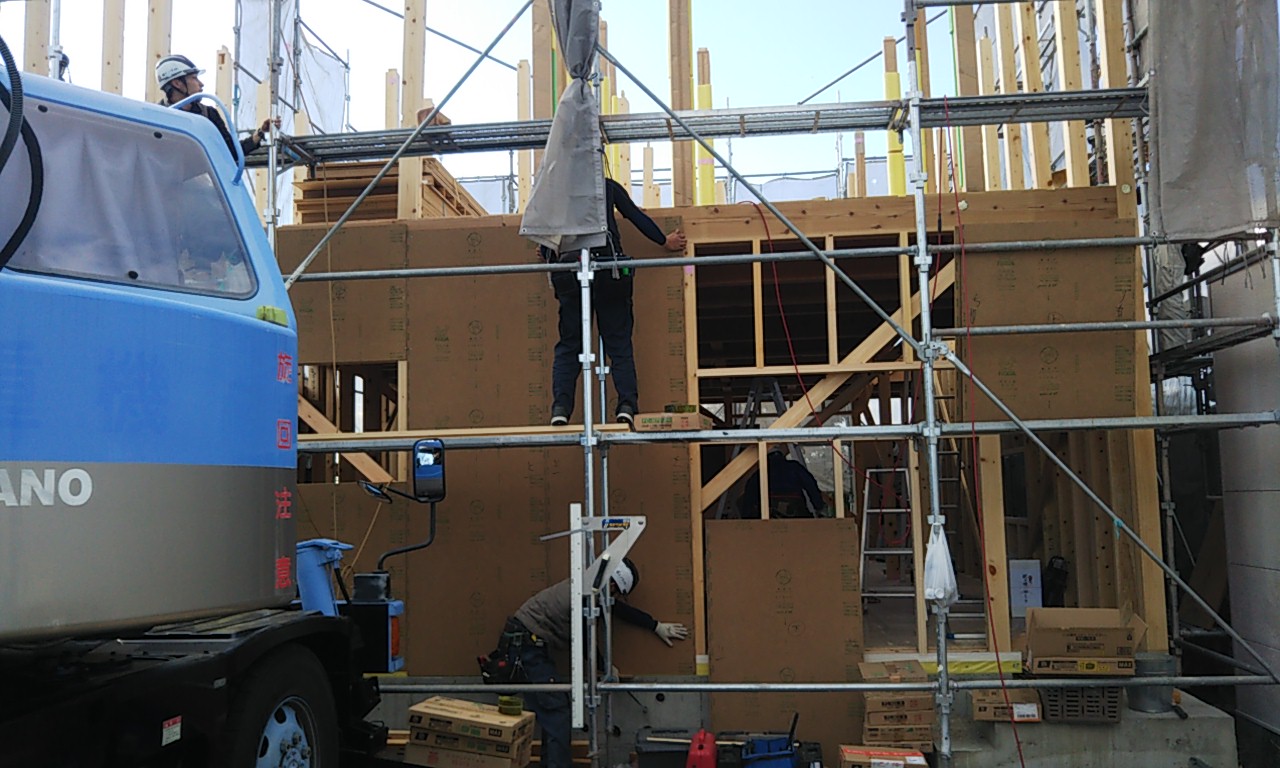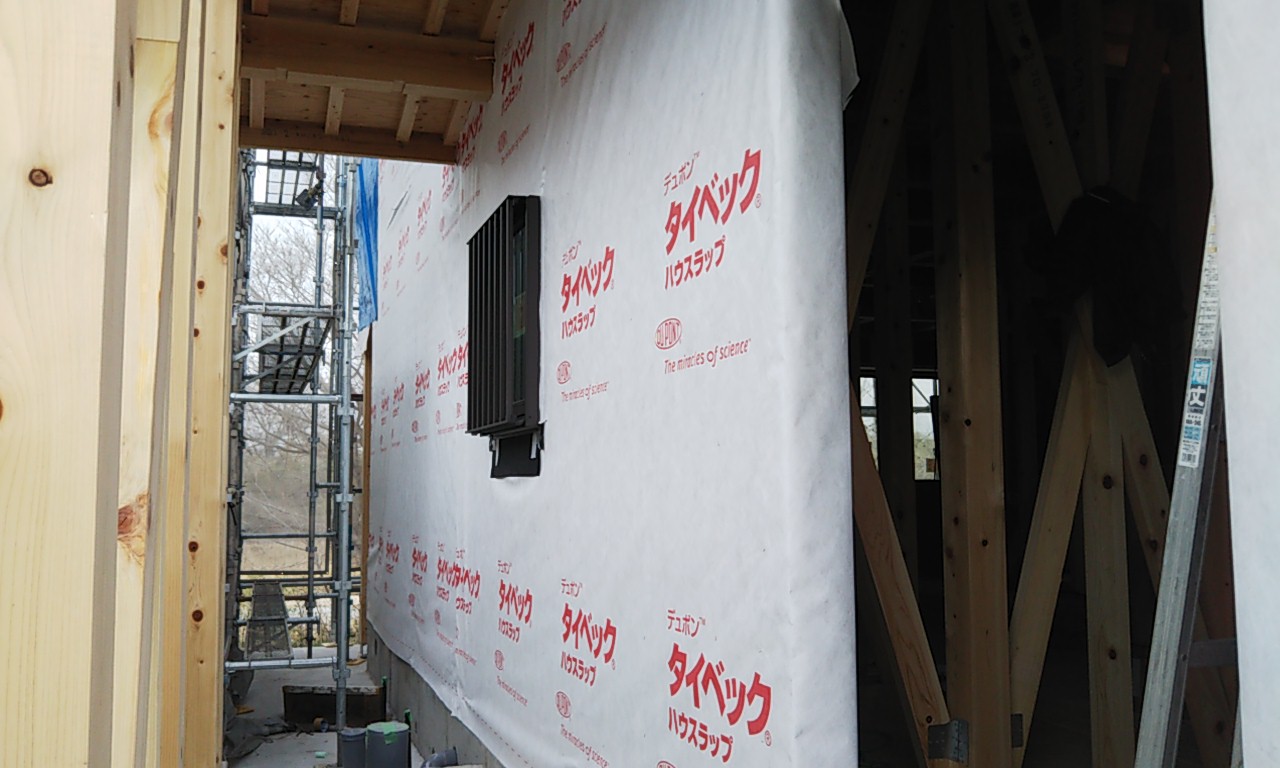外壁の下地材を取付中。外壁には『外壁通気工法』を採用します。壁体内に湿気が籠らないようにするために細い桟を打ち付けていき、それに直行する方向に外壁を張り付けていきます。住宅の瑕疵保証の観点から、全国のほぼすべての木造住宅の工務店が採用している工法です。外壁の仕上がりが縦張りになるか横張りになるかで下地の向き、出幅も変わってきます。それに付随する部分の収まり方も入念に考慮する必要があります。