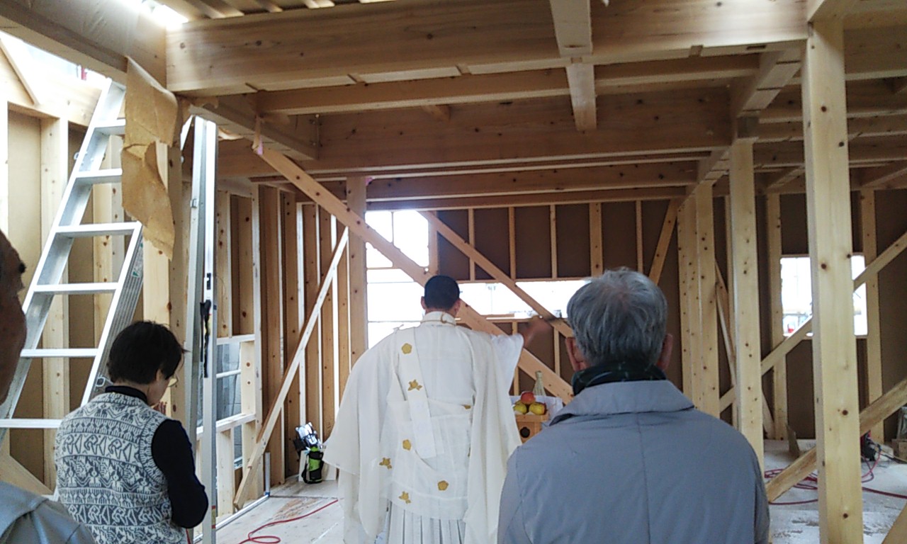暮も差し迫ってきましたが、年内滑り込みの日程で上棟が行われました。まずは建物の四方をお神酒と塩でお清めし、工事の無事を祈願します。