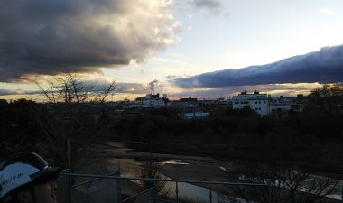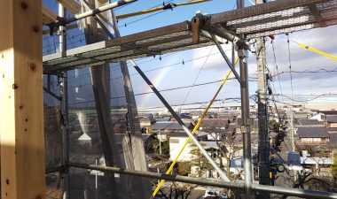 途中から少し雲行きが怪しくなり、小雨がぱらつきましたが天気ももちこたえました。遠方を見ると虹がかかり始め、視線を東の方へ振っていくと某Nスパーランドの方まで完璧な半円を描いた虹が完成しました。日差しは射しますが、現場が少し小高い位置にあり、風通しも良いため眼下に見える住宅街にいるよりもだいぶ強風に感じます。