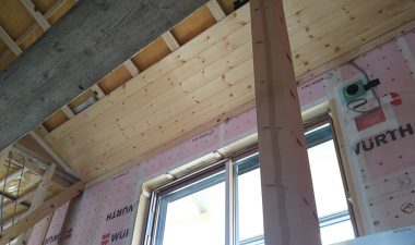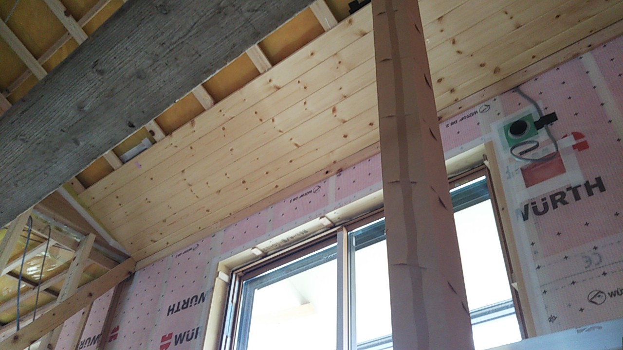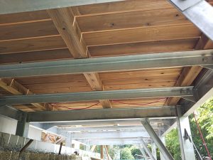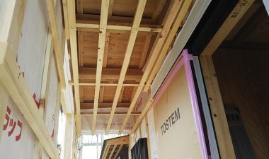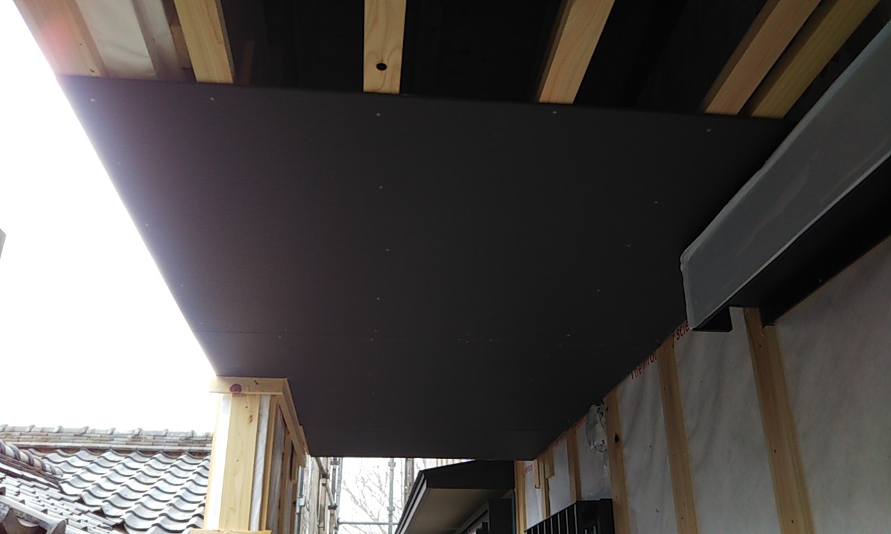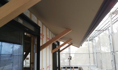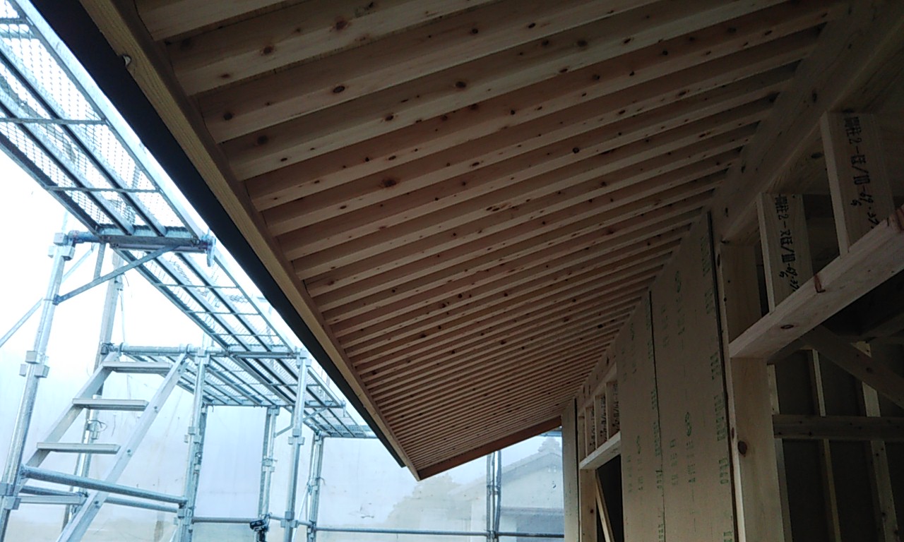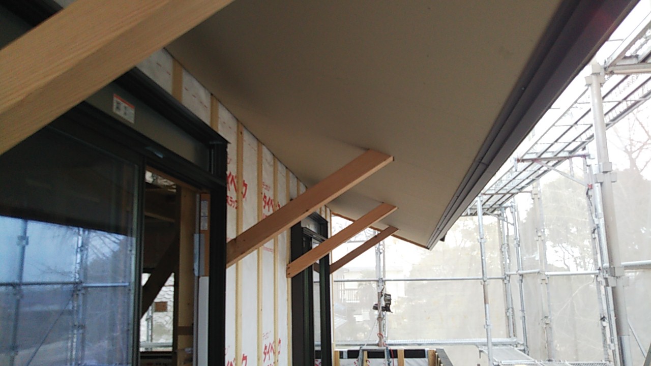 外部の軒下天井を張る工事。南側は軒の出を深くしたため、方杖材で補強をとります。軒天工事をしている職人さん、数日前にぎっくり腰を発症。工程に穴を開けづらいとの事で数日休んだ後に天井を張ってくれました。あまり無理をしないようにお願いします。