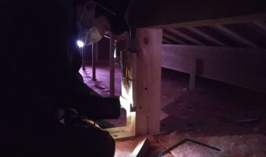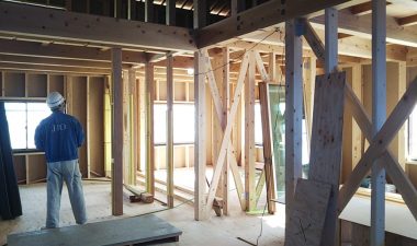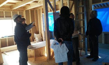 本日はJIOによる瑕疵保証の中間検査です。各構造材を緊結する金物を順次目視確認して回り、設計図書と齟齬が無いかどうかをチェックしていきます。