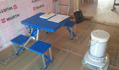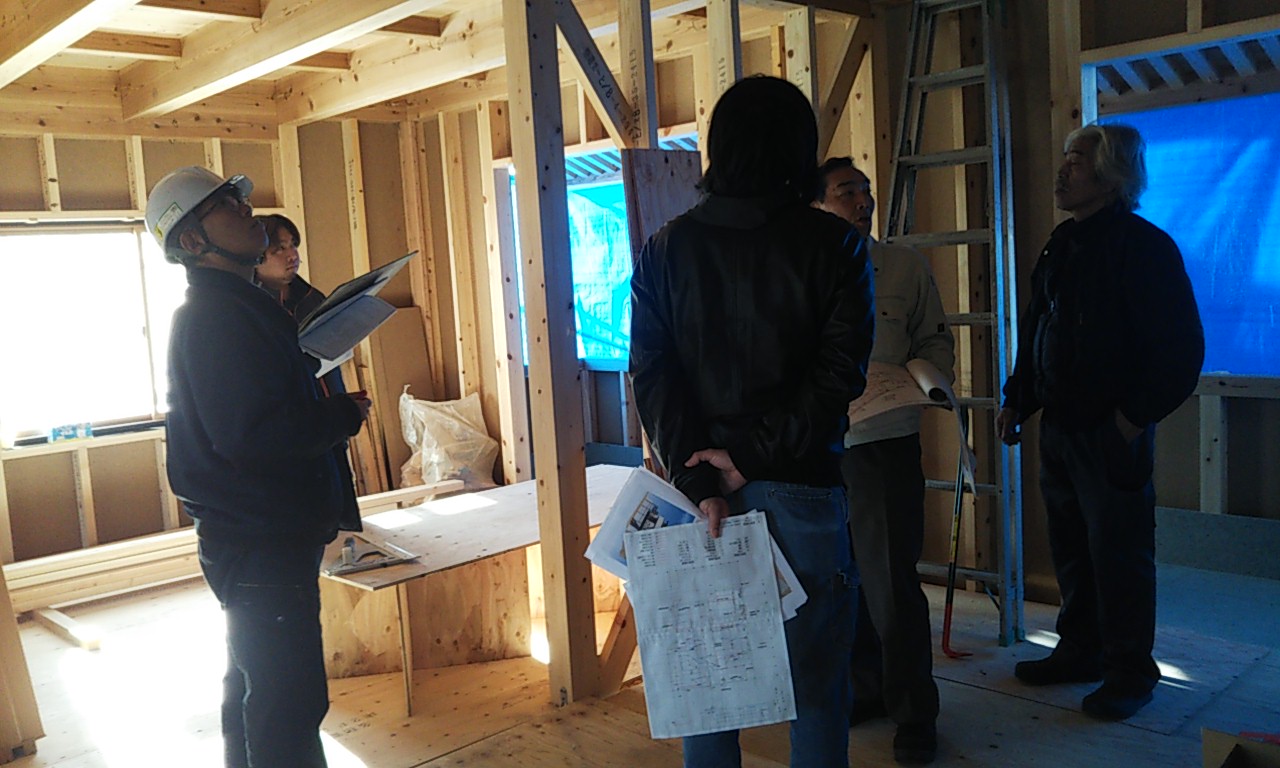 外部では冷たい強風が吹き、凍える寒さの中、現場でのお打合せです。現場内に灯油ストーブを持ち込み暖を取りながら行われました。