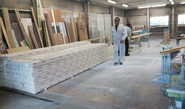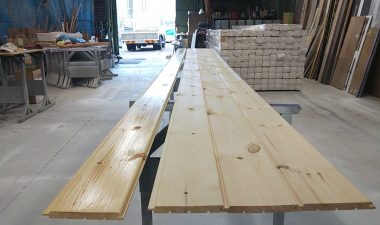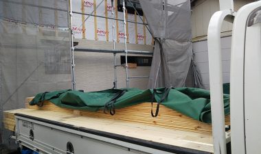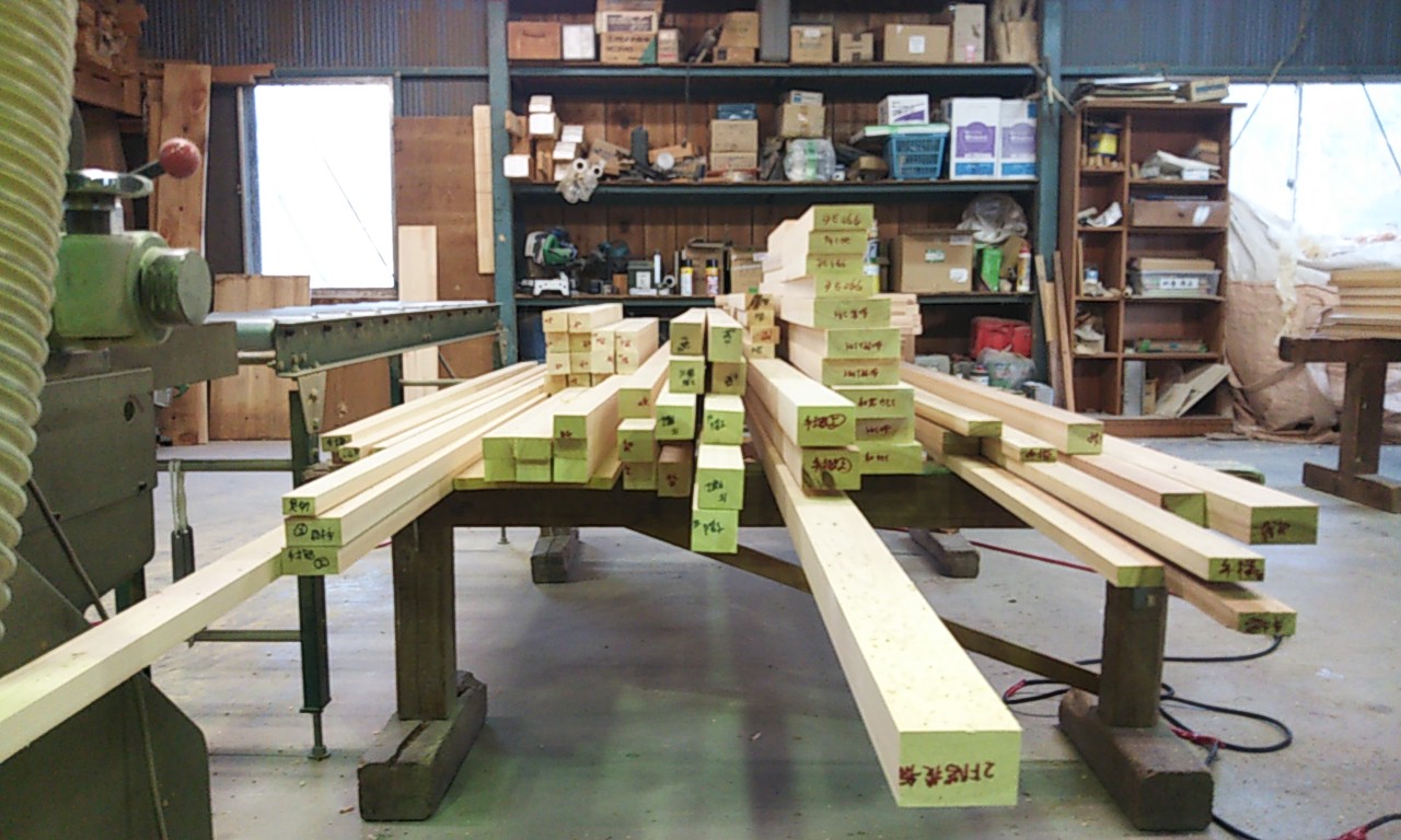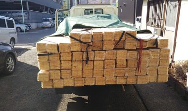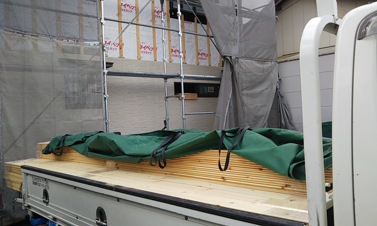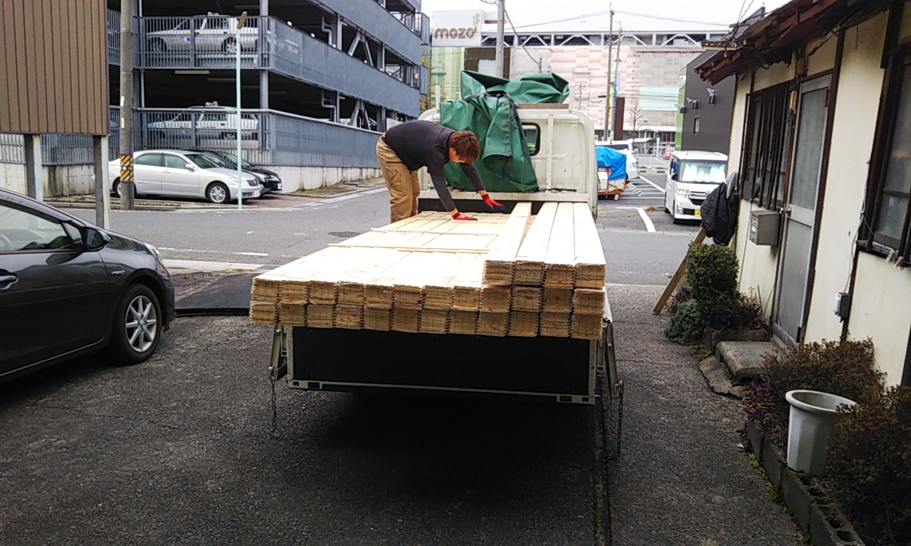 今回の現場には内装材として大量の羽目板を使用します。板にはすべてクリア塗装を施すため、工場に搬入して塗ってもらいます。夏でないだけマシですが、手下しで搬入していて早くも息が切れてきました。
