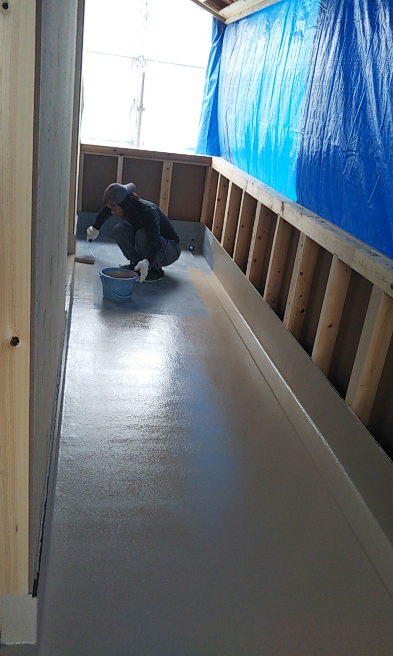 バルコニーのFRP防水工事。相変わらず強烈なシンナー臭が立ち込めます。職人さんは慣れたものですが、初めて作業をする人は気持ち悪くなったりしないでしょうか。