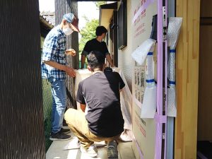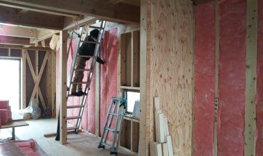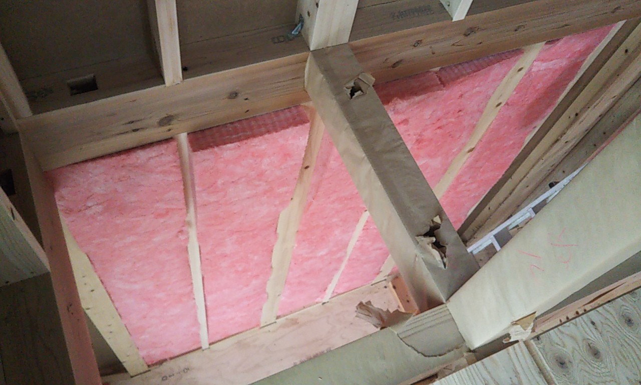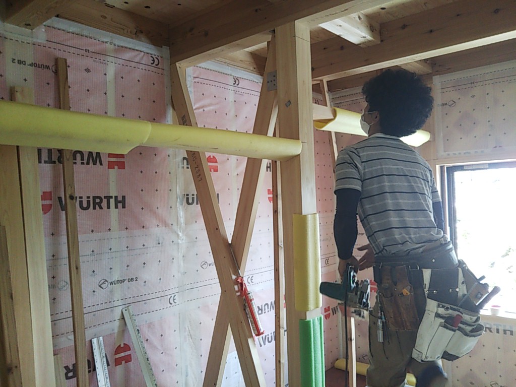 外部が雨模様なので室内の断熱材布設工事を並行して進めます。おなじみのグラスウールを壁の中に充填していきます。