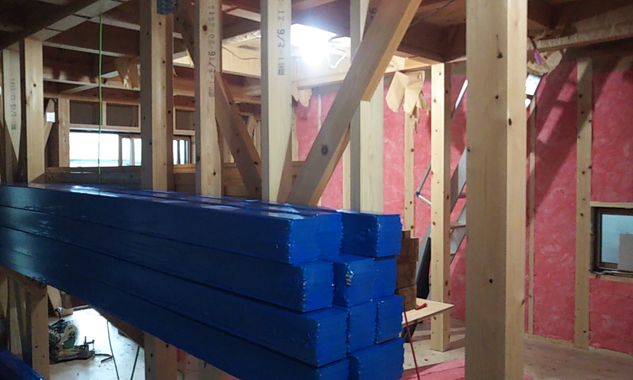青いビニールで梱包されたフローリングが到着しました。床に張る材料のため柱に受けを造り少し浮かして保管します。青と赤の対比が何となく中日対広島のゲームを想起させるのは私だけでしょうか。今年こそは上位目指して頑張ってほしいものです。