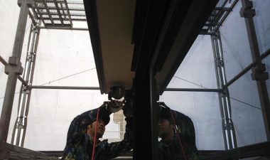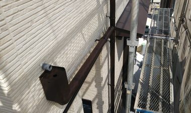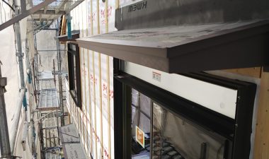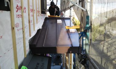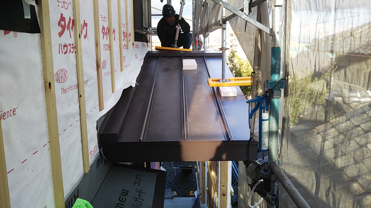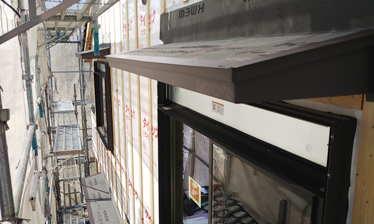 外部の板金工事。今回は窓上の霧除け庇の数が多く、業者さんも大忙しです。