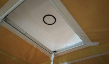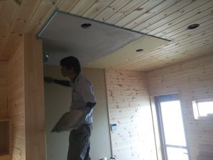 キッチンの天井左官工事。建築基準法による内装制限につきガスコンロを設置するキッチンなどの火気使用室は壁と天井の仕上に可燃材を使用してはいけない事になっています。今回は壁、天井はほとんどが木材で仕上げられていますので、国土交通省告示第225号の規定により、火器の周りだけ不燃材料で仕上げる、という手段を使います。漆喰などの塗り壁は不燃材料に指定されていますのでコンロの上部だけ塗材で仕上げます。