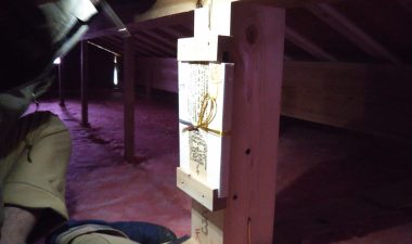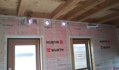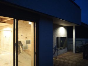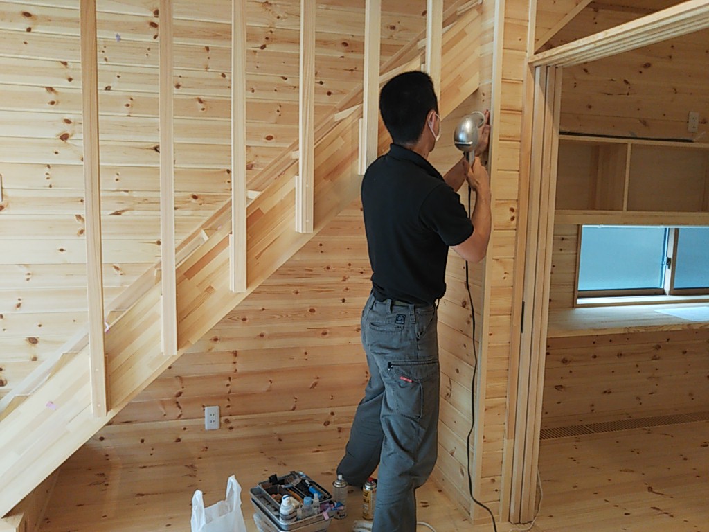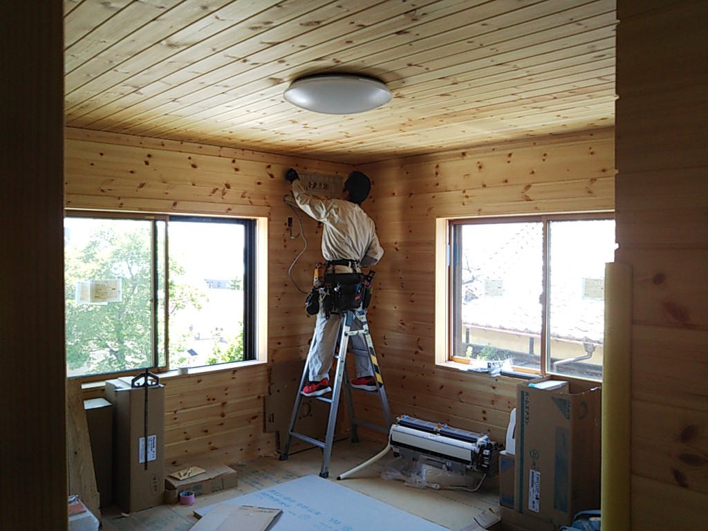 照明器具やスイッチ等、電気設備の仕上げをしてもらっていっています。仮設電源から仮に住宅内に通電させ、照明器具の点灯試験も行います。