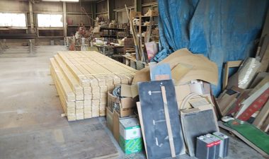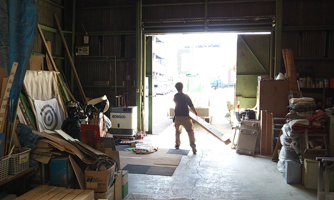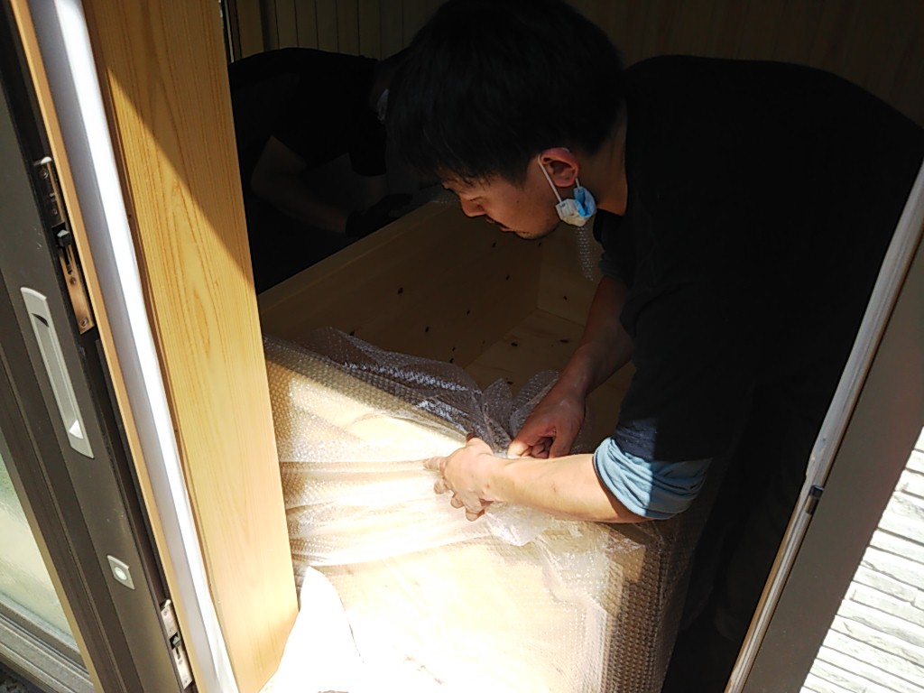 搬入を終えた室内に存在感を持って鎮座する材料。筆者はすでにフラフラですが、K谷君は相変わらず涼しい顔です。この材料がまだ半分工場に残っており、次回は2階への搬入ということを考えると先が思いやられます。