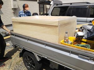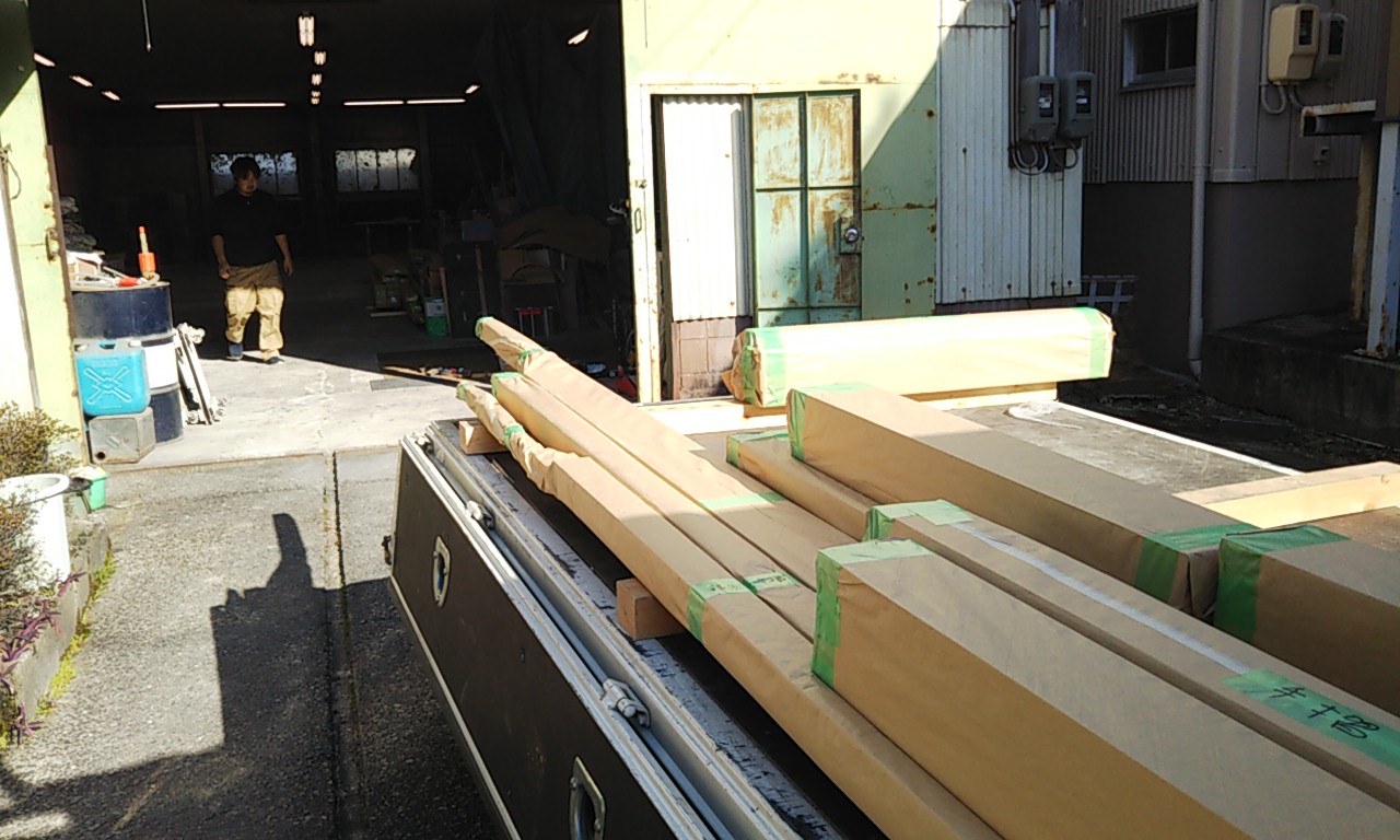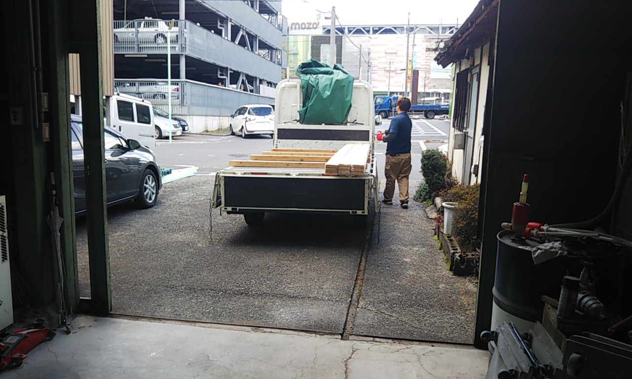 名古屋の塗装工場に預けて塗装をしてもらっていた羽目板を運搬するためにトラックでやってきました。一度にすべては運べませんので、ひとまず半分だけ積載します。それでもかなりの数量、そして重量。体力のある若手K谷君頼みの運搬作業です。残りの半分はまた後日引き上げにうかがいます。