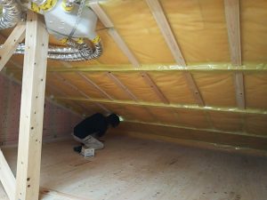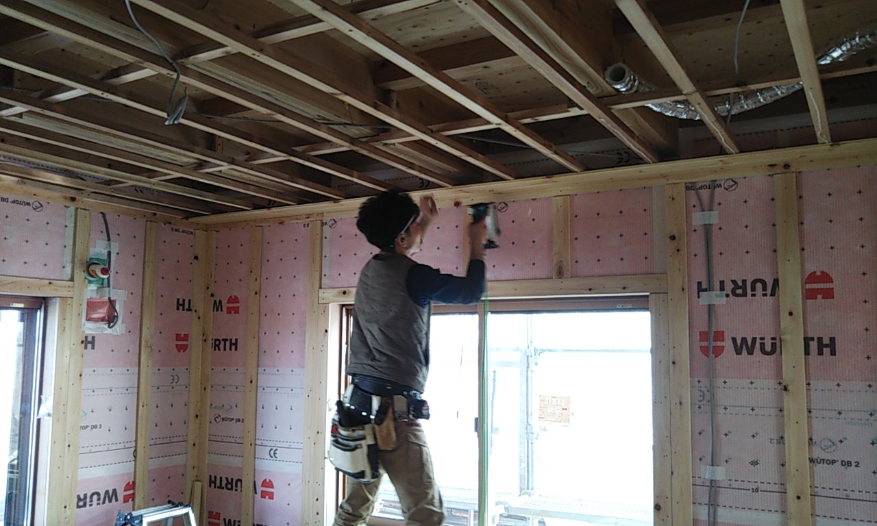 壁、天井の断熱気密工事が進んでいきます。高気密高断熱住宅の精度を高める要の工事です。ここをしっかりと行っておけば、工事中も比較的暖かく作業できます。