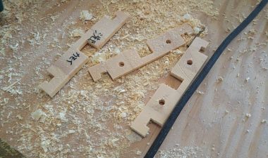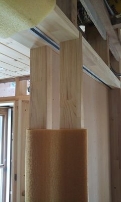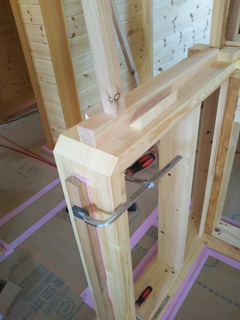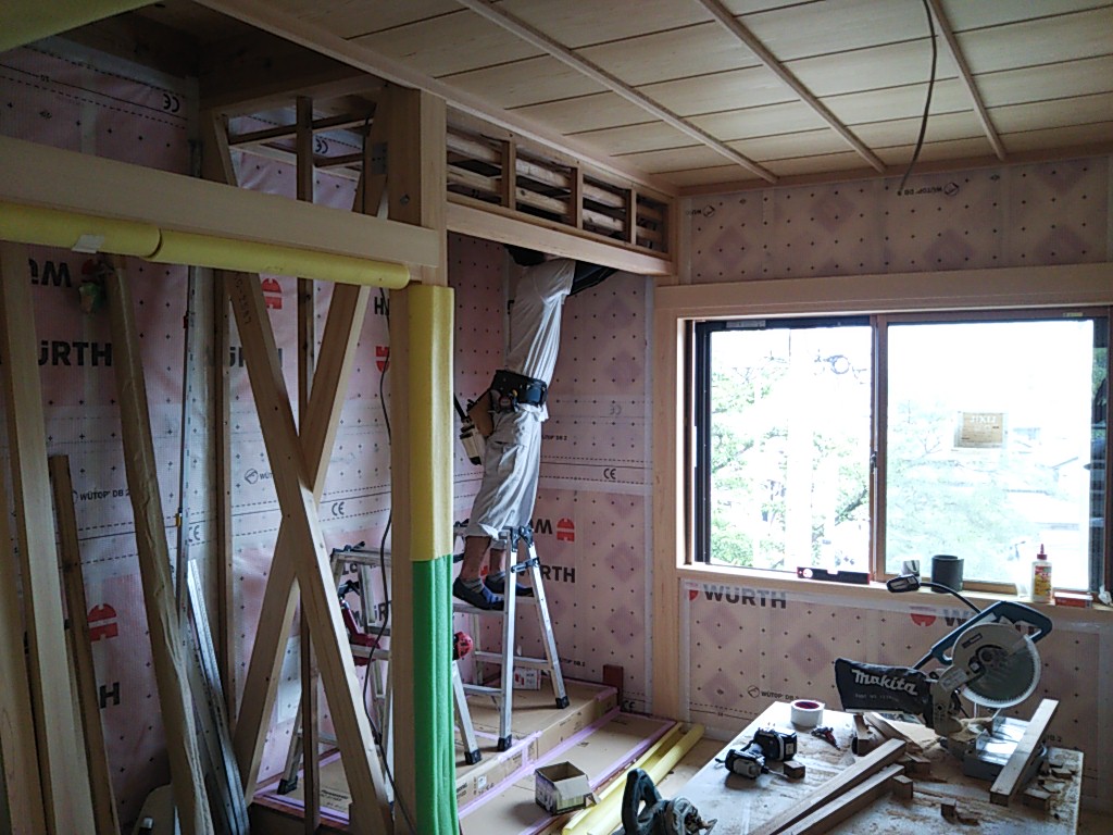 2階では和室の造作材にかかっています。建具の鴨居を取付けるために見えない部分にボルトを仕込む作業。K保木君の腕の見せ所です。