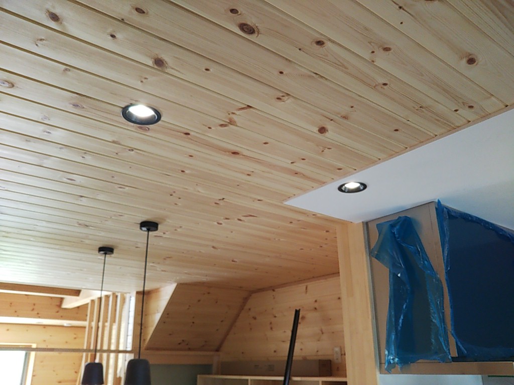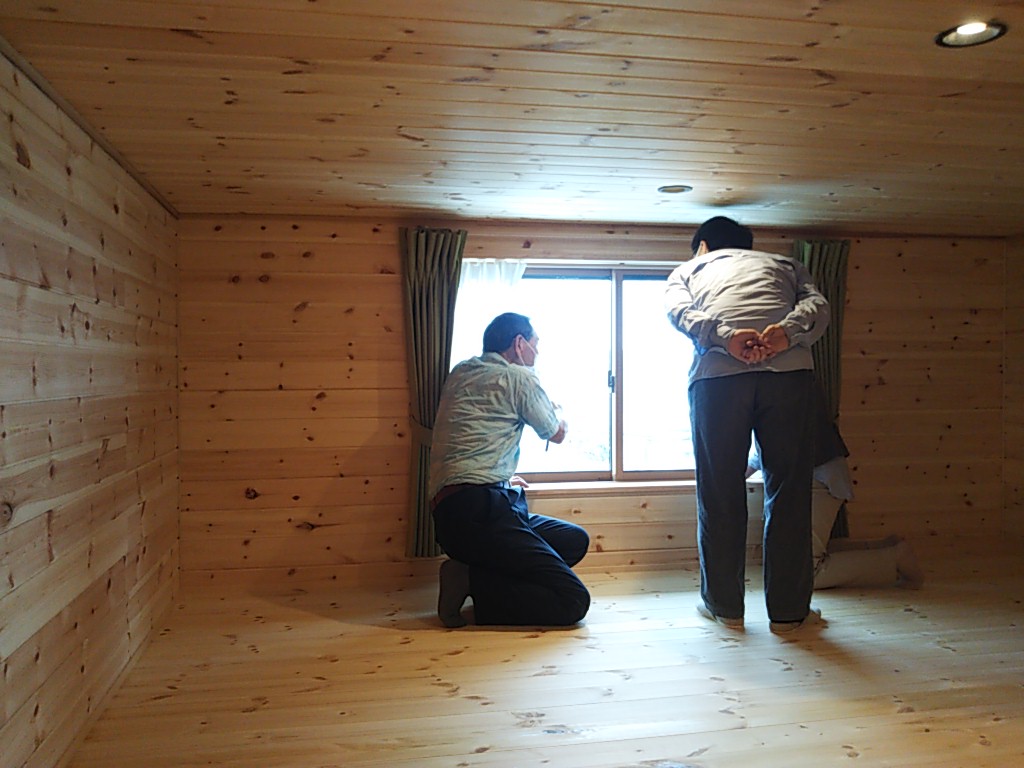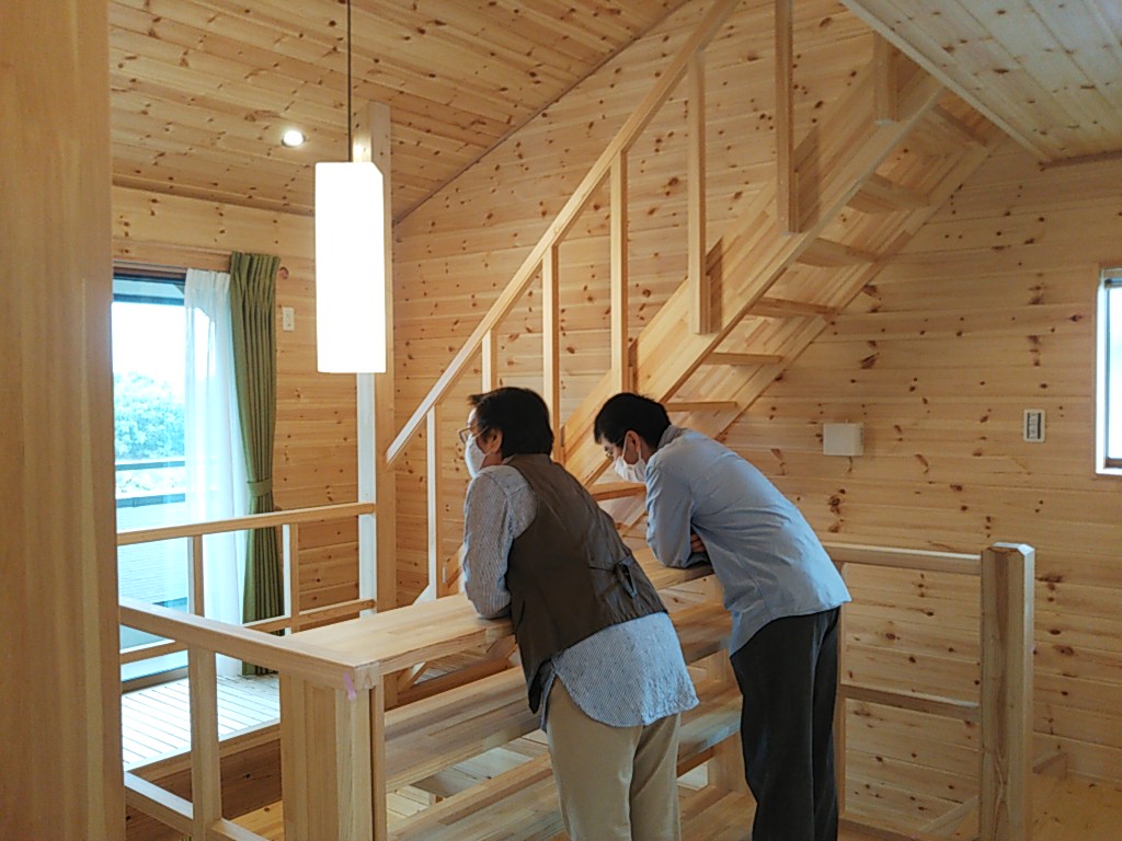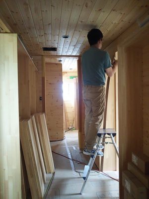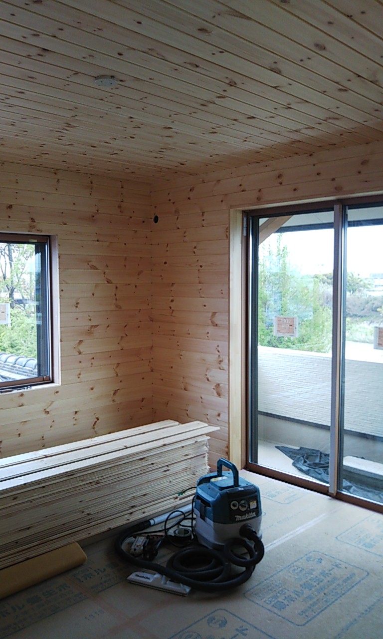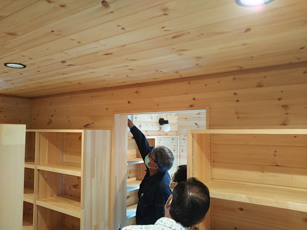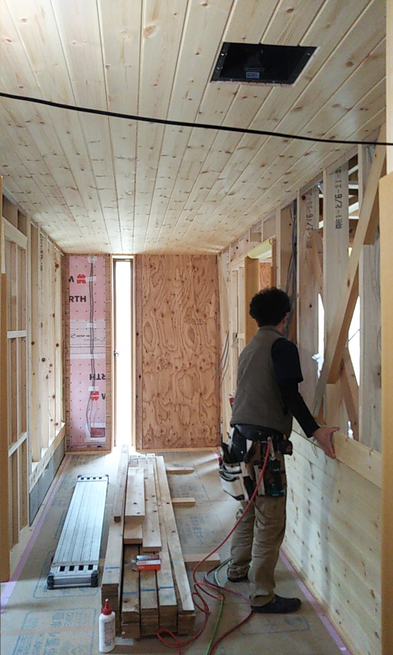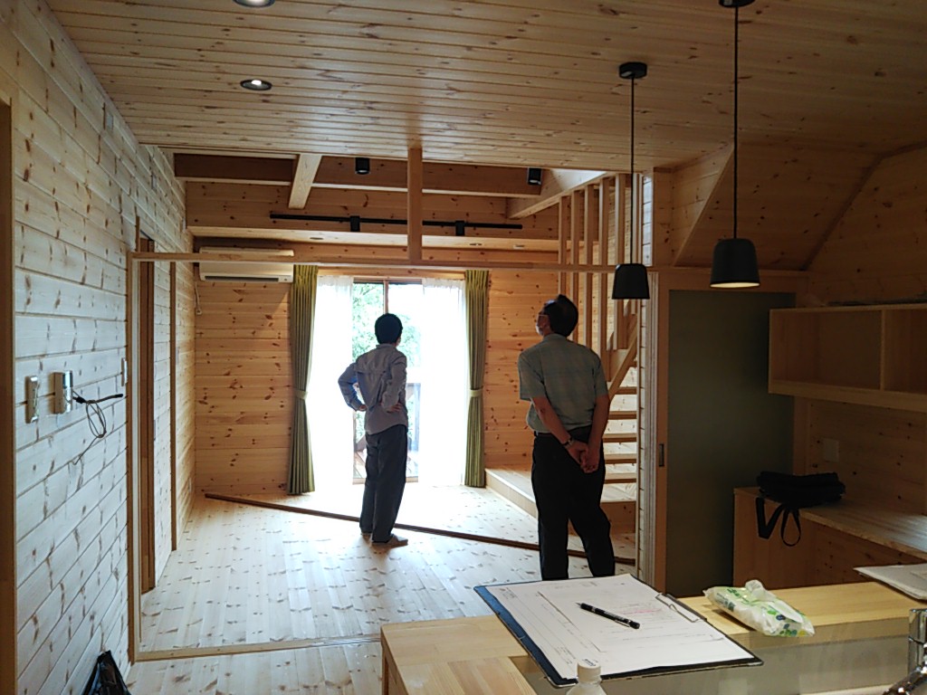 内部の仕事完了後、初めてn様の内見。ご実家やご親戚の住宅も今回の設計士さんが過去にリフォームを手掛けられ、やはりこのような壁天井羽目板張の内観だそうです。新築でここまでつくりこまれるのは初めてとの事で興味深げに内見されました。同時にどのような家具を置くか、どの配置にするかをいそいそと測定されました。もう間もなく外構工事も完成し、お引渡しの日が近づいてきました。