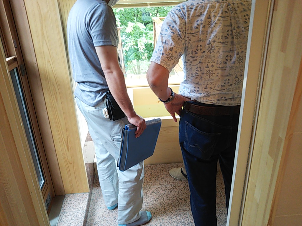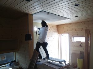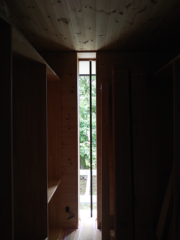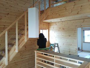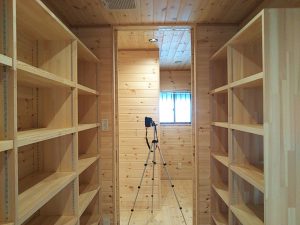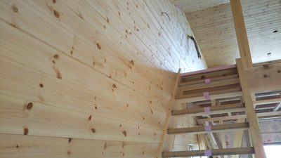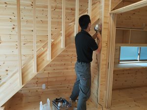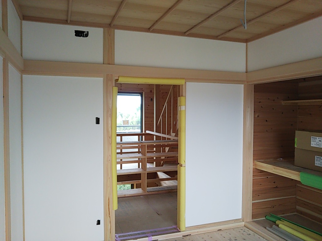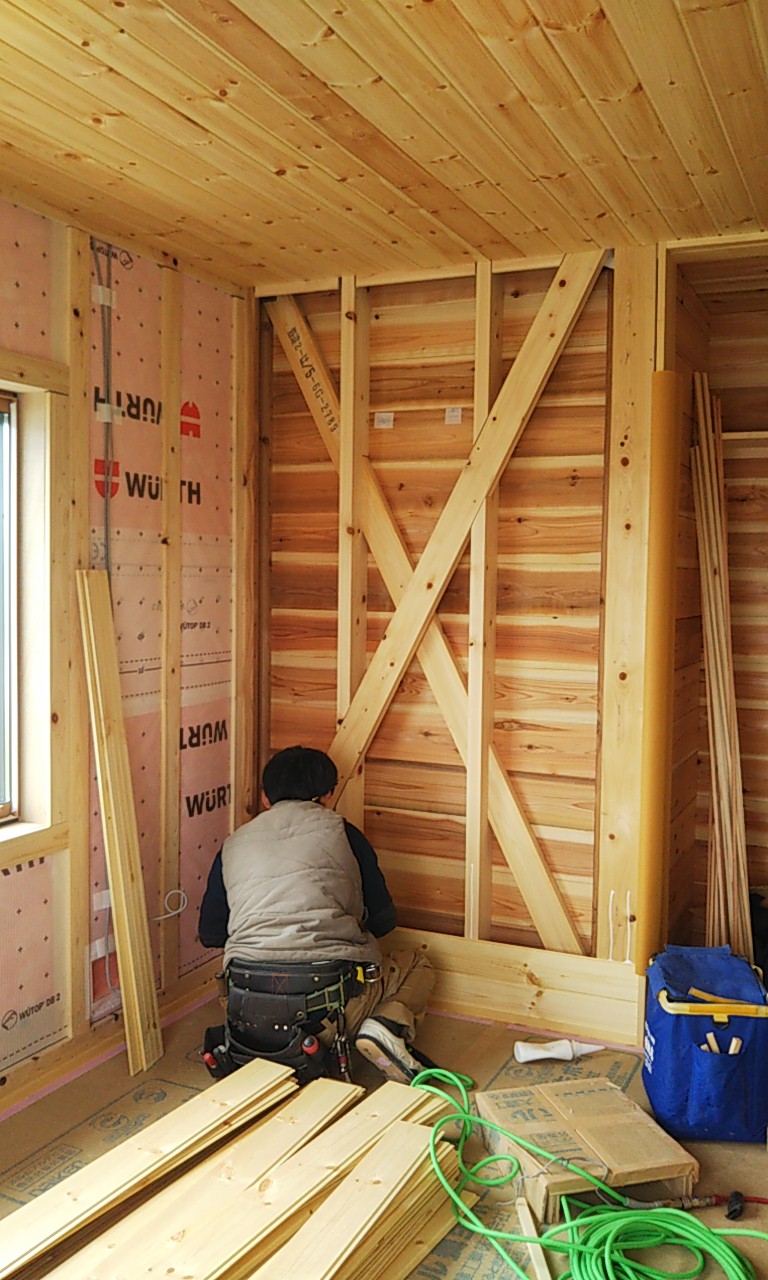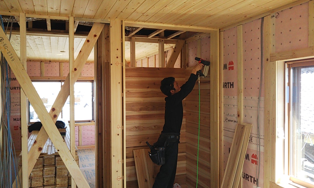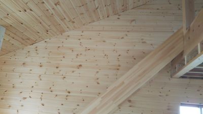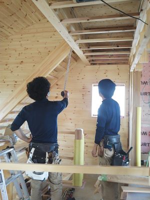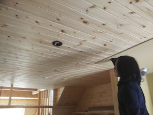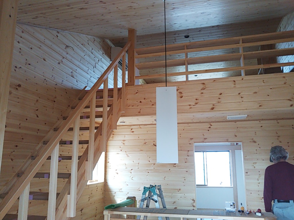 内部の仕事完了後、初めてn様の内見。ご実家やご親戚の住宅も今回の設計士さんが過去にリフォームを手掛けられ、やはりこのような壁天井羽目板張の内観だそうです。新築でここまでつくりこまれるのは初めてとの事で興味深げに内見されました。同時にどのような家具を置くか、どの配置にするかをいそいそと測定されました。もう間もなく外構工事も完成し、お引渡しの日が近づいてきました。