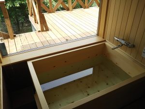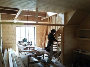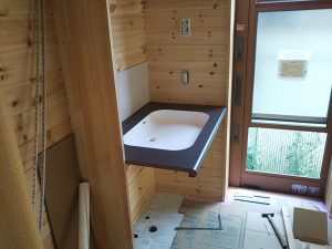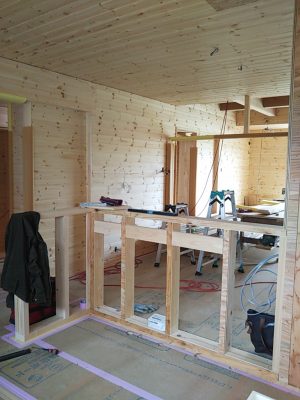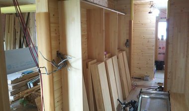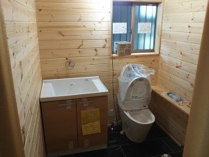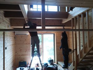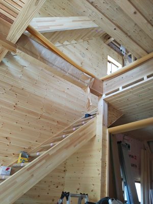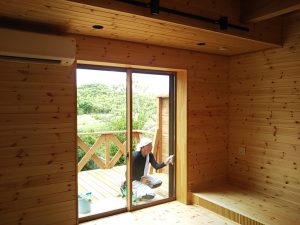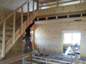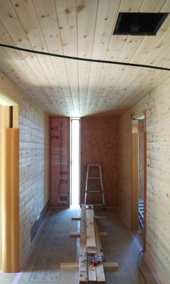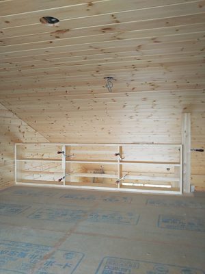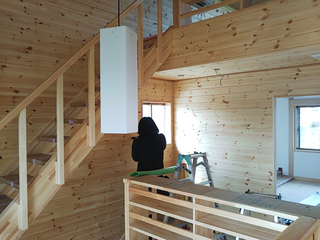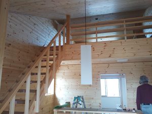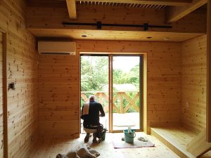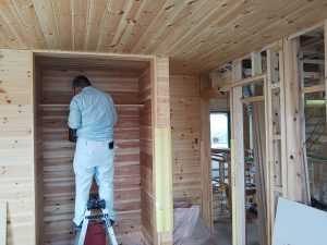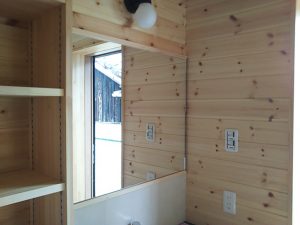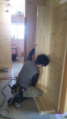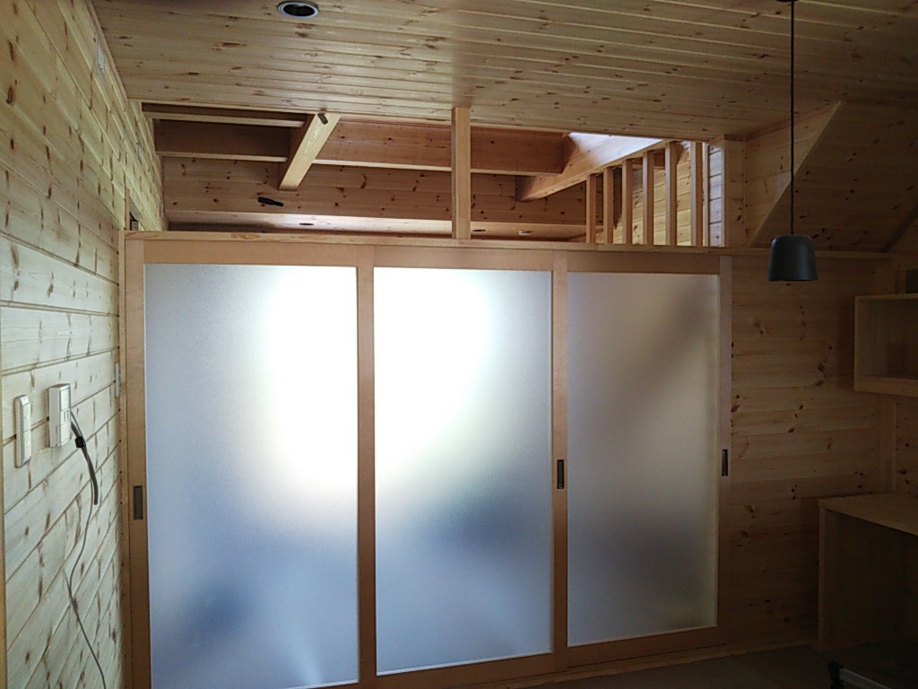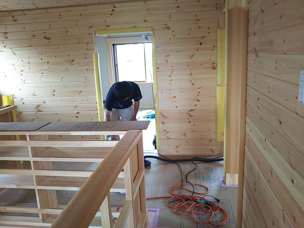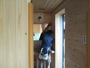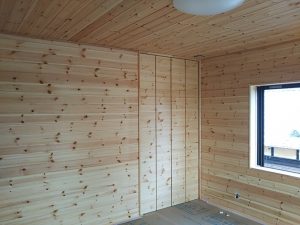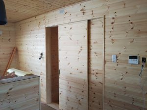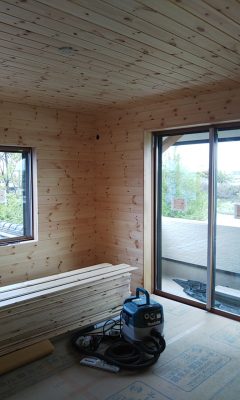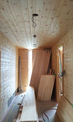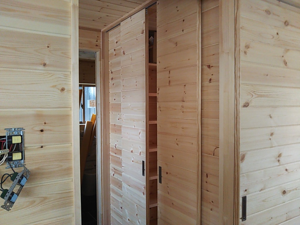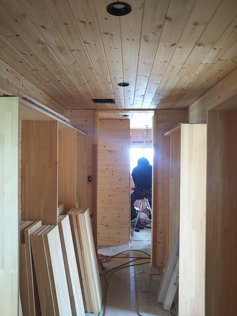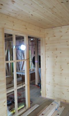各部屋に建具が取り付けられました。一部を除いて壁と同じパインの羽目板ヨコ張の仕上です。徹底してロッヂ風の内観。今回はクロス張りの部屋が一つもありません。