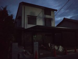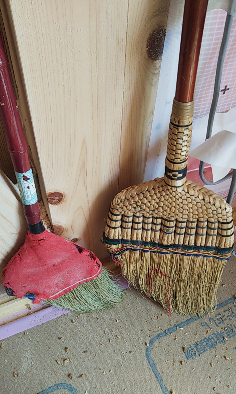 夏が近づき日が長くなったものの、その日が落ちるまで作業し、時間がすっかり遅くなりましたが、最後に室内の床養生をめくり軽く掃除しておきます。苦労した現場の分、この瞬間が爽快です。電力の引き込みはまだ先ですが電気業者さんが仮設で通電しておいてくれたので明るい中で作業ができます。