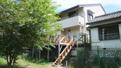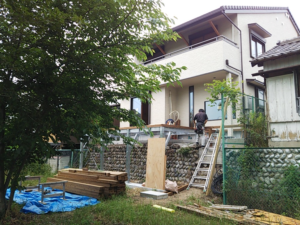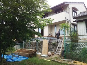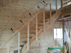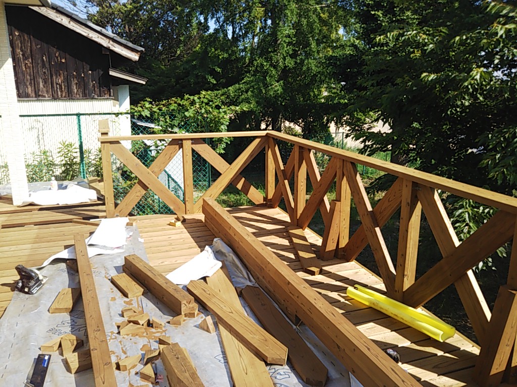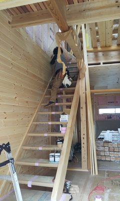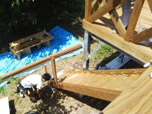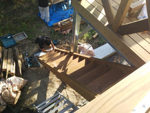 外部のウッドデッキができ上りました。階段に手すりを付けて落下防止対策を取ります。この階段を下りて下の部分の敷地をドッグランにされるとの事。