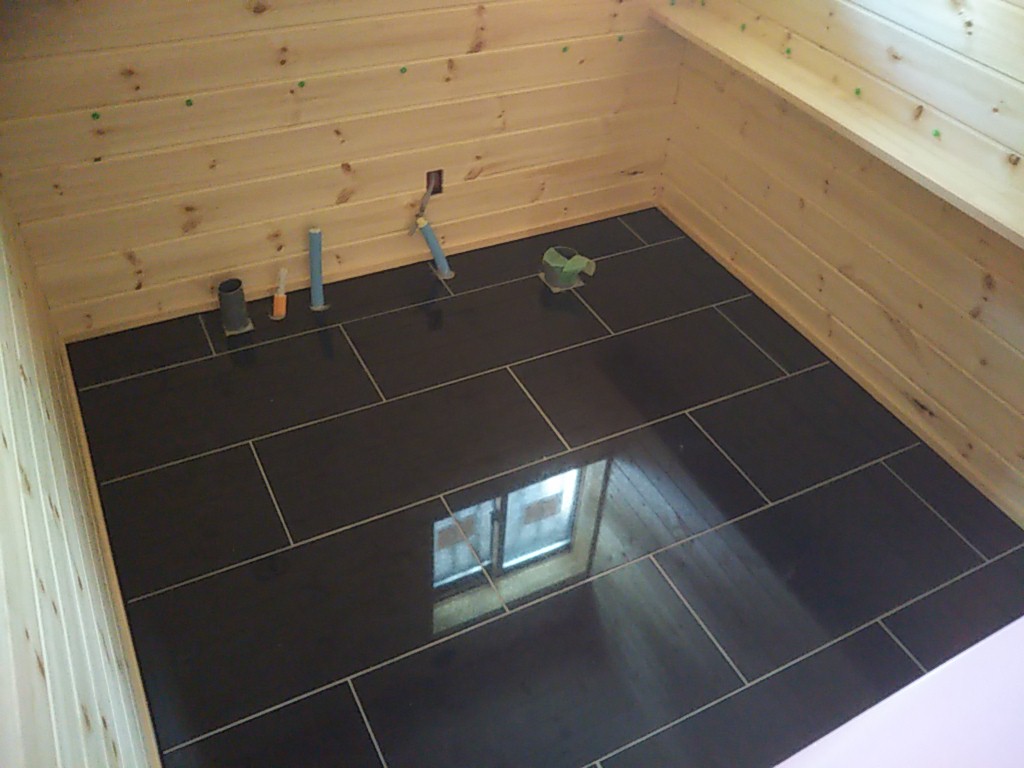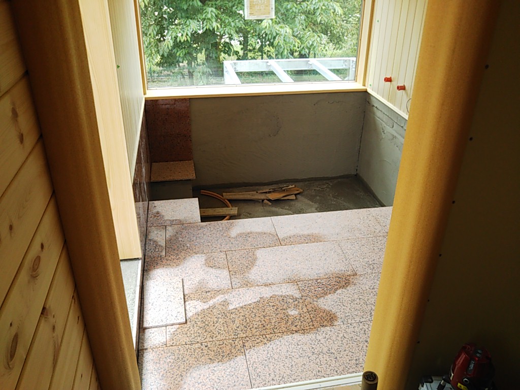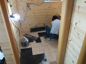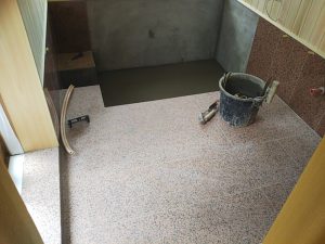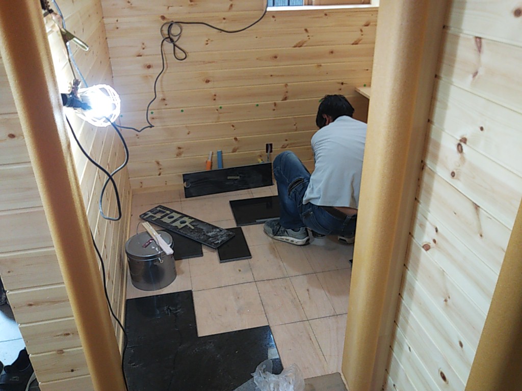 内装床の御影石張りの作業中。フローリングと違い重厚感があります。