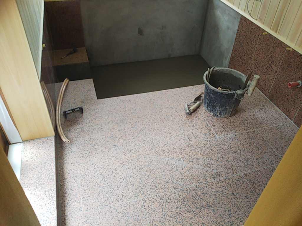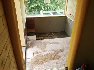 左官業者さんが工事に入りました。今回はお風呂もユニットバスではなく床と壁が石貼りになります。下塗を施すためのシートやメッシュの敷設を行います。