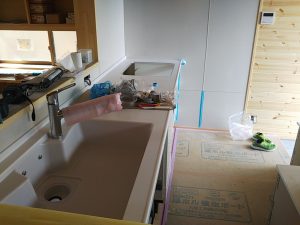 キッチンの取付工事。今回は背面収納も同メーカーの製品で揃えましたので、作業量も増大。職人さん二人掛で取付を行ってもらっています。