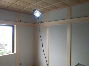 和室漆喰塗の下塗り。知らない人が見たらこういう色の仕上がりか、と言うほどきれいに塗れています。