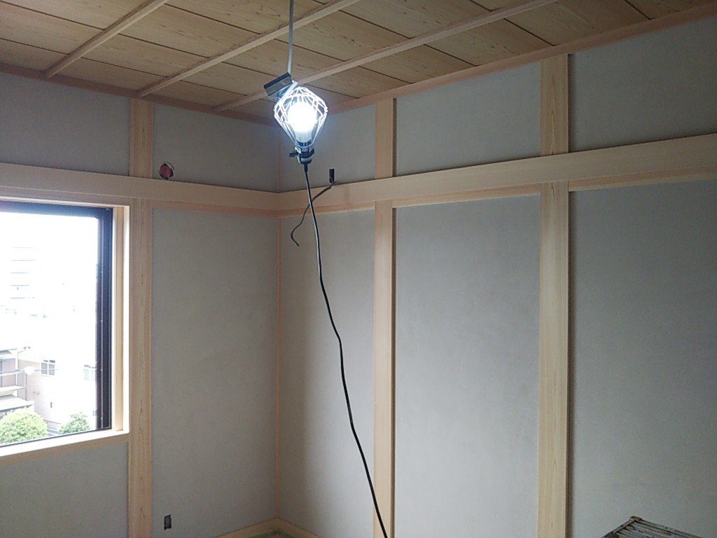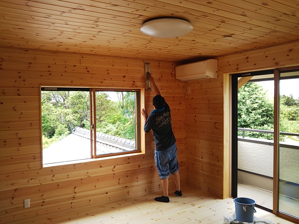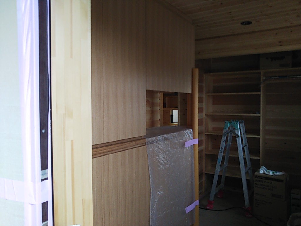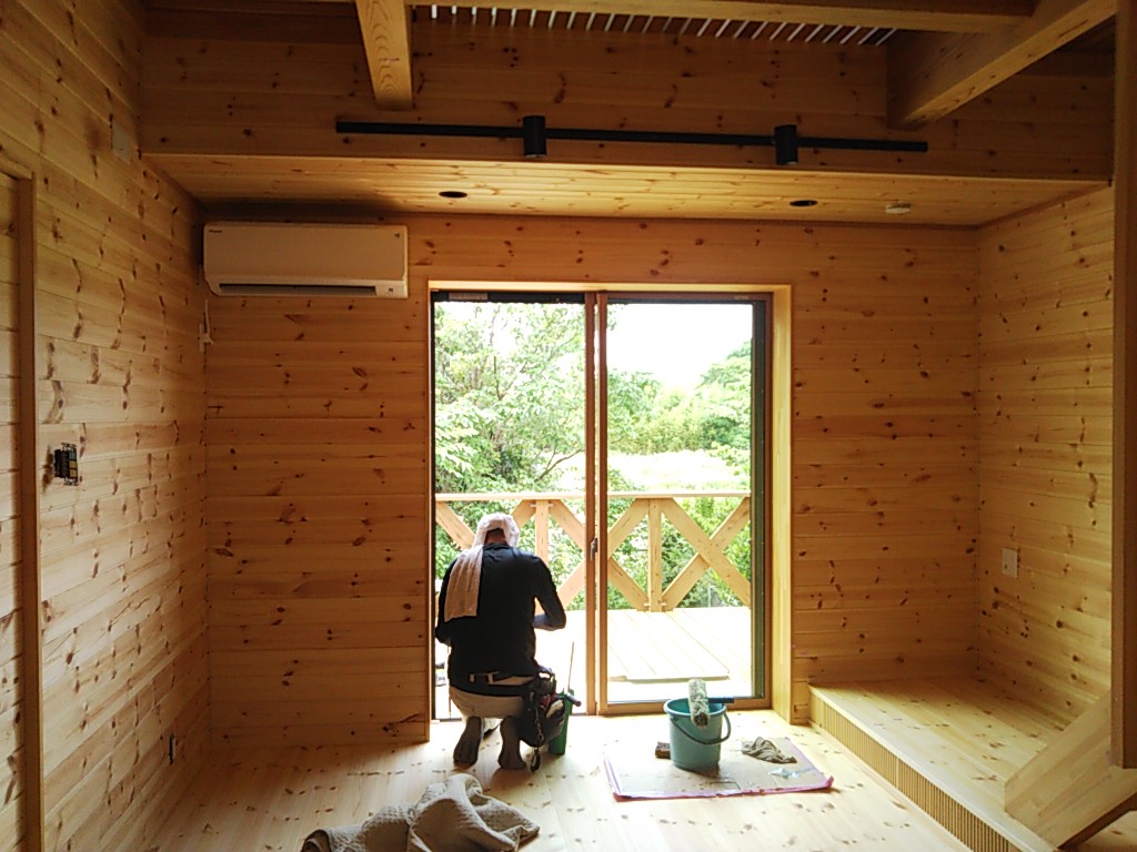 内部では補修作業中。造作その他工事中についてしまった疵を補修します。今回は見渡す限り羽目板なので、造作中の疵でなくても比較的数が多く、二人掛でほぼ一日補修を行ってもらいました。