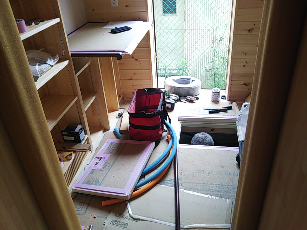 エアコン取付工事。朝夕はまだ涼しいとは言え、エアコン業者さんのこの重装備。慣れてしまえば大丈夫なのでしょうが、見ている方が汗が出てきます。