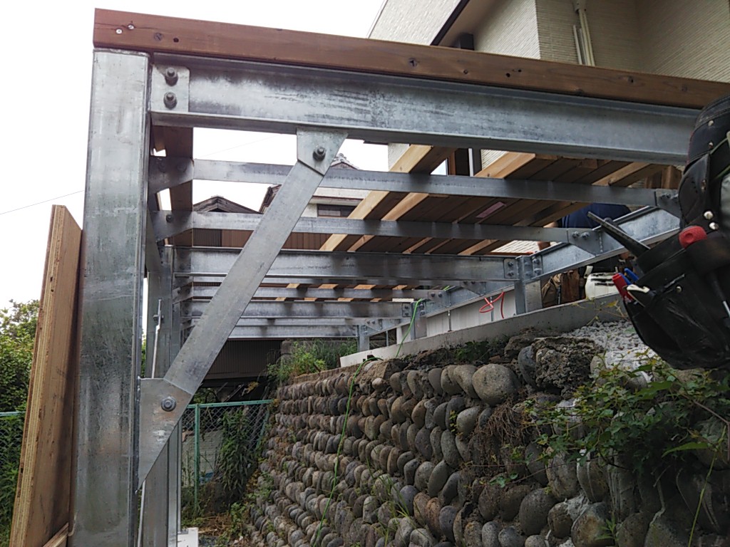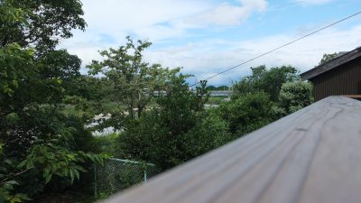若手大工の二人は室内の造作が終了しましたので、今度は外部のウッドデッキの制作に取り掛かります。住宅の上棟の前に仕込んでおいた鉄骨にようやく出番がきました。出来上がればデッキから望む目の前の川、鉄道の鉄橋、その向こうに見える四日市工業地帯のパノラマビューが臨めます。なんだかうらやましいですな。