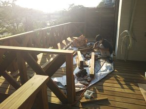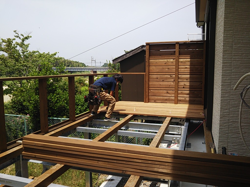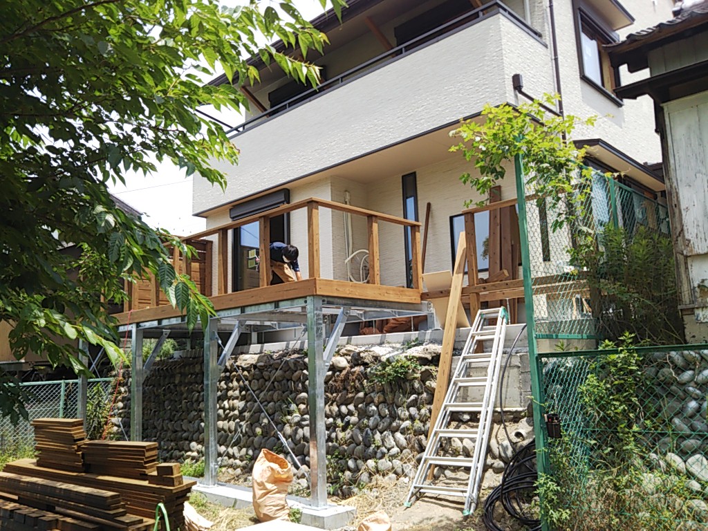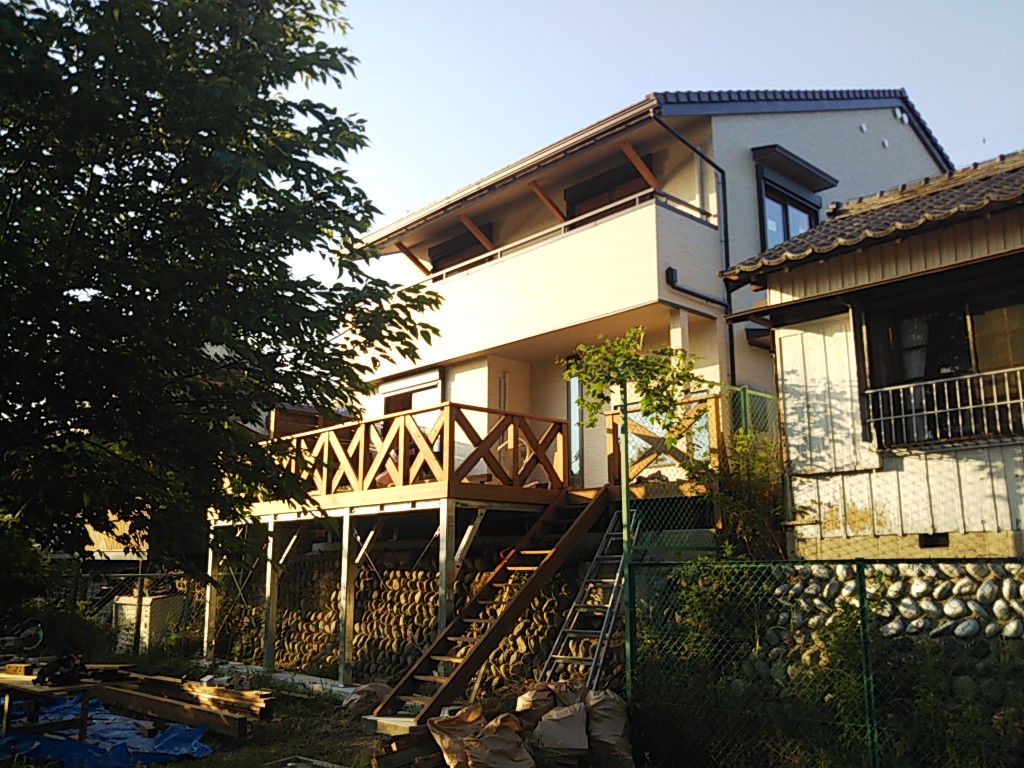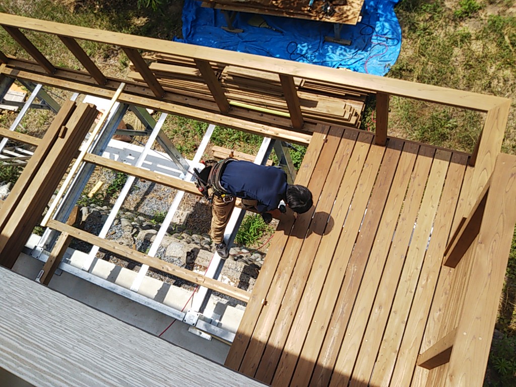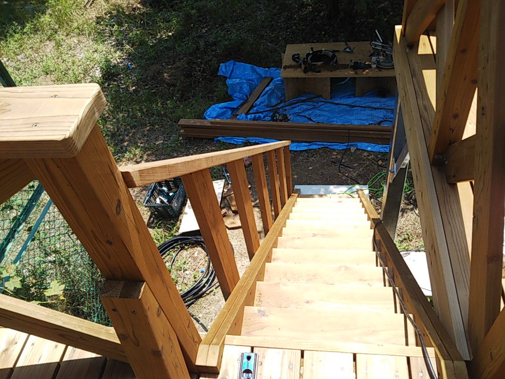 ウッドデッキももうそろそろ完成です。敷地下段まで結構高低差がありますので、階段の長さも思っていたより長く見えます。