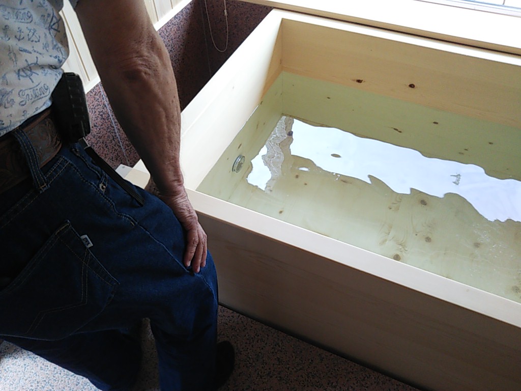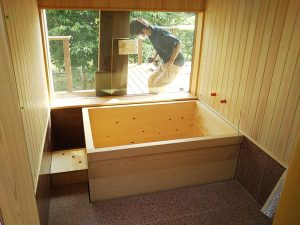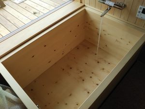 高野槙の浴槽に漏れる部分が無いかチェックするために水を張ってみました。濡らす事でかえって木材がわずかに膨張し、隙間を塞ぐことで漏水を防ぐ効果もあります。