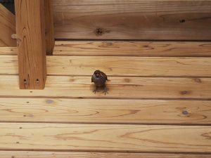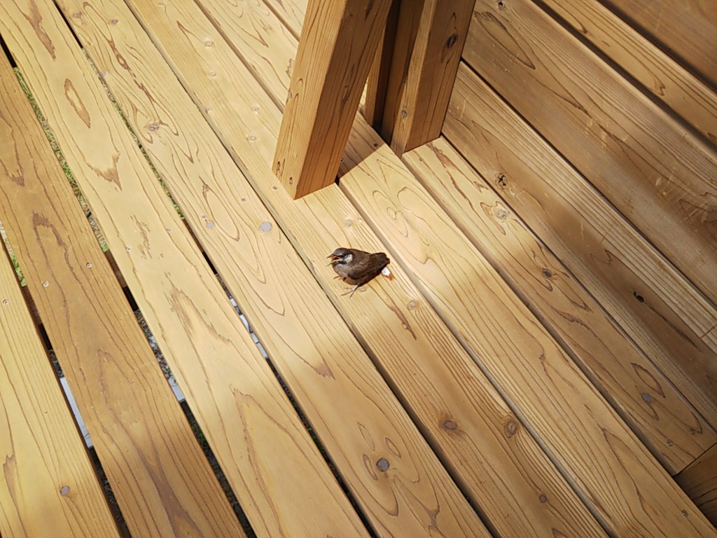 現場にいた設備業者さんが手招きして呼ぶので、何事かと思って行くとデッキの上に瀕死(のような)状態の鳥が横たわっていました。目撃した業者さんに聞くと、飛んできた鳥が掃き出し窓のガラスに激突、跳ね返って倒れたそうです。いわゆるバードストライク(違う)。しばらくして起き上がりましたが、目の焦点が合わず嘴も半開きのまま飛んでいこうとしません。脳震盪でも起こしているのか、ずっとこの状態でしたが、さらにしばらくした後は姿が見えなくなっていました。無事に飛んでいけたようです。