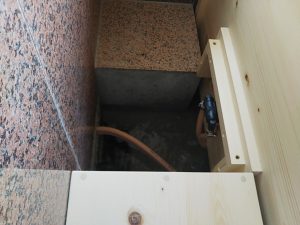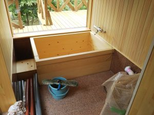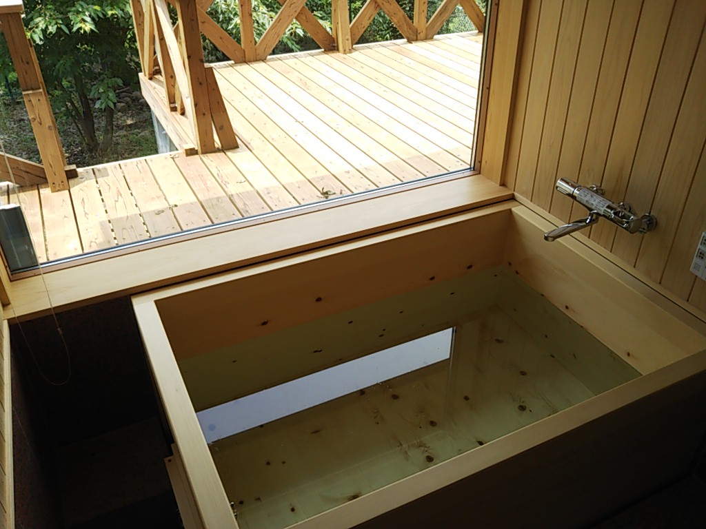 昨日満水にしておき、先ほど給湯器の追炊きも試運転した浴槽の水も抜いてみます。一度浴槽から下部の土間に排出し、土間に設置したドレンから外部のトラップ桝に流れる仕組み。映画などでしか見た事はありませんが、ネコ足のバスタブを使用する場合と同じです。